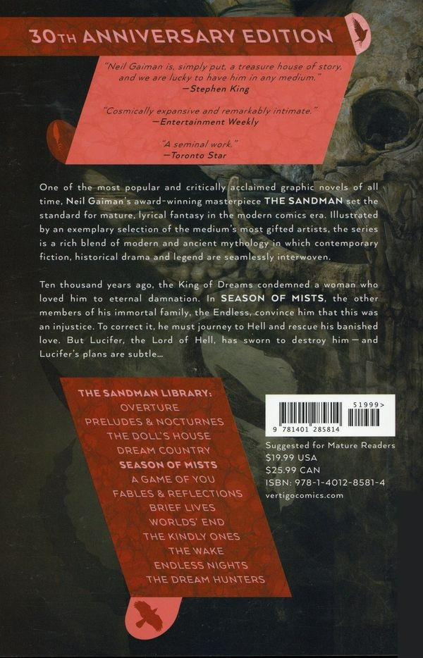Résumé: The 30th anniversary of Neil Gaiman's incomparable series THE SANDMAN continues with this new edition of SEASON OF MISTS, featuring a new cover by Dave McKean and a new introduction by comedian and actor Patton Oswalt! Ten thousand years ago Morpheus condemned a woman who loved him to Hell. Now the other members of his immortal family, the Endless, have convinced the Dream King that this was an injustice. To make it right, Morpheus must return to Hell to rescue his banished love-and Hell's ruler, the fallen angel Lucifer, has already sworn to destroy him.
