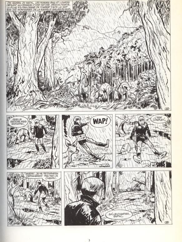 Une trépidante aventure, avec de la gadoue comme Lambil sait si bien la suggérer. Le kangourou est utile, mais ses interventions restent presque dans les limites du vraisemblable. La poursuite du camion est vraiment une bonne séquence. Heureusement que les femmes de bandits sont moins corrompues que leurs époux et que les tueurs tirent sans précision.