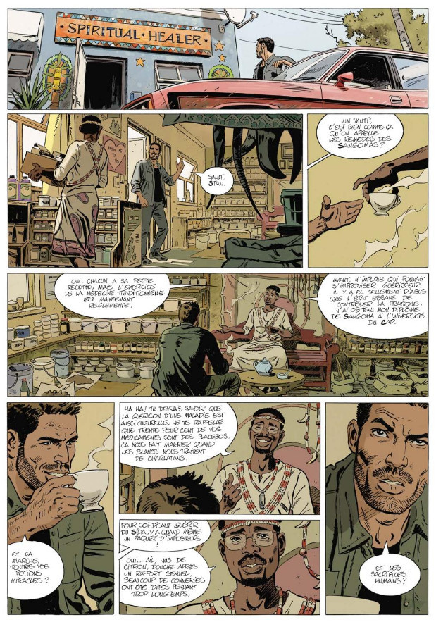 Après Zulu Caryl Férey nous invite à nouveau en Afrique du Sud post-apartheid. La nation construite dans la douleur peine encore à trouver ses couleurs "arc-en-ciel" pour sortir de l'antagonisme noir & blanc et pas sûr qu'un remède de Sangoma (un guérisseur, un sorcier) suffise à lui redonner des couleurs. Férey et son dessinateur, Corentin Rouge, nous plongent au cœur des discussions sur la redistribution des terres accaparées. Pendant les débats houleux au parlement, un meurtre est commis dans une exploitation vinicole. C'est un flic blanc qui va mener l'enquête : Shane Shepperd traîne son look de Bob Morane entre les townships et une trop jolie maîtresse black. Tout cela nous vaut de belles pages sur les vignobles du Cap ou ses townships. [...] Personne ne veut faire un pas vers l'autre, comme si les positions s'étaient figées du temps de l'apartheid. [...] C'est plus l'apartheid, mais on s'échine pareil pour gagner de moins en moins. La ferme est une exploitation, oui, et c'est nous qu'on exploite. La réforme agraire va changer les choses, je vous le promets ! [...] Le meurtre de cet ouvrier agricole est repris en boucle sur les réseaux sociaux pour raviver de vieux conflits. Comme on pouvait s'en douter avec Férey, le texte est très explicatif mais l'album réussit à condenser dans ses quelques 150 pages, une intrigue complexe où tous les personnages sont reliés les uns aux autres : Bob Morane (!) aura bien du mal à démêler les mensonges, ceux d'aujourd'hui comme ceux du passé.Le 15/09/2023 à 18:53:23