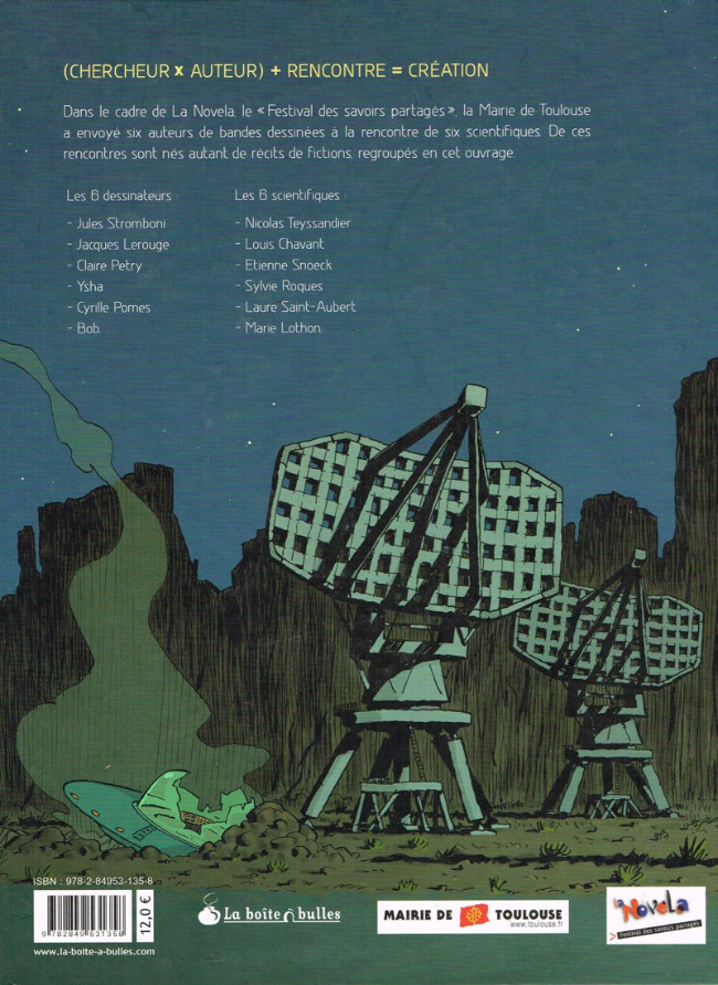 Résumé: À l'initiative de la Mairie de Toulouse, afin d'accompagner "La Novela, le Festival des Savoirs partagés", 6 auteurs de bande dessinée ont été envoyés à la rencontre de 6 scientifiques. Leur mission : ramener de cette entrevue une bande dessinée de fiction de 8 pages.