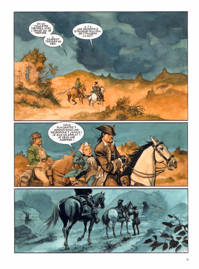 Je l’attendais avec impatience ce nouveau Scorpion. Et je ne suis pas déçu ! En plus, Marini et Desberg nous offrent un 64 pages plutôt qu’un 48. Evidemment, il a fallu attendre cinq longues années pour connaître la suite… et c’est long ! Combien d’années avant le treizième et dernier album (d’après ce que j’ai pu lire) ? Et le tome six des Aigles de Rome, M. Marini ? Concernant « Le mauvais augure », l’album est identique aux premiers de la série, bondissant et plein de surprises. Sa lecture va vite mais j’ai avalé les pages avec gourmandise et délectation comme un mort de faim. Je trouve que Marini a une science du mouvement incroyable qui se manifeste avec brio surtout de la page 31 à 35. Dans cet épisode, tout semble aller de mal en pis entre Aristote Weindorf dit Le Hussard et le Scorpion. Le Hussard semble désabusé par l’égoïsme du Scorpion mais ce qu’il lui apprend ou plutôt lui suggère en page 58 nous donne le sujet du dernier album. On sait enfin comment les Trebaldi tiennent les grandes familles. On peut aussi se demander comment tout cela a pu être conservé à travers les siècles. Quoi qu’il en soit cet album est excellent. Pourvu, pourvu qu’il ne faille pas attendre cinq ans pour connaître la fin. Fin heureuse ? J’espère que Méjaï et le scorpion se retrouveront et plus si affinité…BDGest 2014 - Tous droits réservés