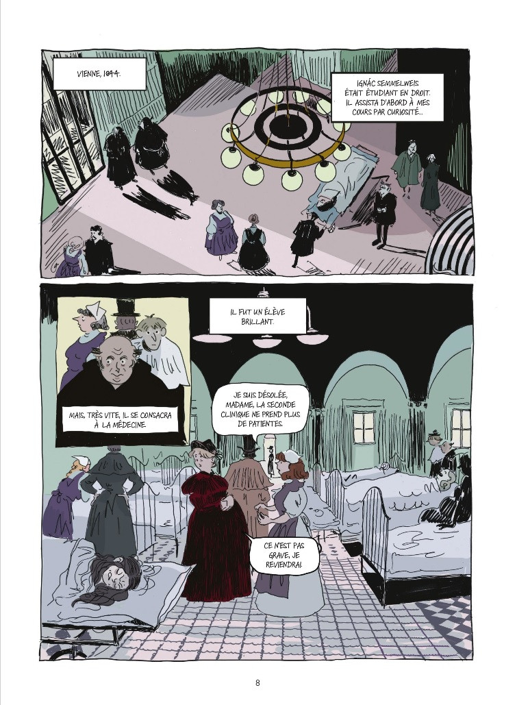 Navigant entre les genres, Isabelle Bauthian (La vie mystérieuse, insolente et héroïque du Dr James Barry (née Margaret Bulkley), Opportune, Horizons, Don Juan des flot, À la table des empereurs) renoue avec la biographie dessinée à travers un album retraçant l’existence d’Ignác Semmelweis (1818-1865). Si le nom de cet obstétricien hongrois ne parle pas d’emblée à l’individu lambda, il est néanmoins bien connu par le personnel médical et paramédical. Et pour cause : il est parvenu à établir le lien entre la dissection de cadavres dans l’une des cliniques les plus réputées de Vienne et la recrudescence de décès de parturientes liés à la fièvre puerpérale. Bref, bien que le docteur ne l’ait pas formulé ainsi, il a ouvert la voie vers la théorie microbienne et imposé un modèle prophylactique.