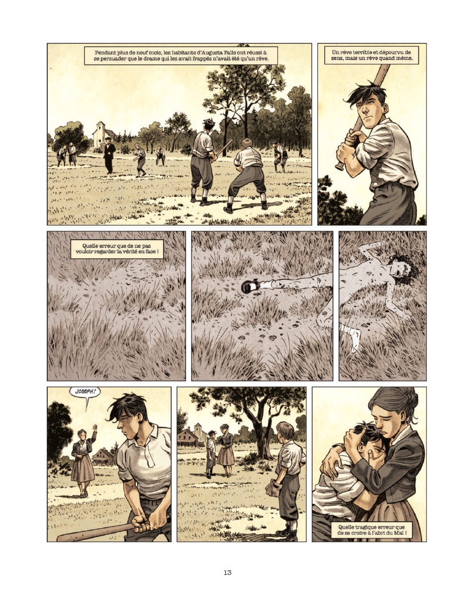 Augusta Falls (Géorgie – USA). 1939. Joseph Vaughan est un écolier tranquille, rêveur, amoureux de toutes les filles, doué pour l’écriture, très apprécié par sa jeune institutrice, mademoiselle Webber, qui l’incite à prendre part à un concours d’écriture. On pourrait croire que malgré les conditions de vie difficiles de sa famille et de celles des autres habitants de la petite ville et des fermes alentours, il mènerait une vie paisible. C’était le cas jusqu’au jour où fut découvert le corps d’une écolière, pas n’importe laquelle, Alice Ruth Van Horne, dont il était précisément amoureux à ce moment-là et avec qui il envisageait un avenir heureux. La petite a subi des sévices que la décence ne m’autorise pas à décrire ici. Qui est le coupable ? Pour certains habitants de la région, ce ne peut qu’être un « nègre » de passage. Serez-vous surpris si je vous dis que c’est notamment une idée partagée par un ami de la famille Vaughan, un homme d’origine allemande… Tiens, depuis deux mois les Allemands ont déclenché la guerre en Europe… Est-ce bien avisé de sa part d’accuser d’autres hommes d’un crime ? Mais les « nègres » sont-ils des hommes ? C’est la question que certains se posent dans ce sud très marqué à cette époque-là par le Ku-Klux-Klan, ces encagoulés « ô combien courageux » puisqu’ils n'hésitaient pas, armés et en nombre, à pendre de pauvres noirs dont le crime le plus horrible était leur couleur de peau. Racistes ces Américains-là ? Oh, comment osez-vous ! Et que fait la police ? Oh, sûrement occupée à regarder ailleurs… Peu après, le père de Joseph décède. Les conditions de vie de sa famille n’étaient déjà pas terribles, voilà qui ne va pas les améliorer. Pourquoi s’arrêter en si bon chemin ? Tant qu’à cultiver les mauvaises nouvelles, allons-y pour une autre : une nouvelle fillette a été assassinée dans d’horribles conditions. Joseph se sent coupable de ne pas avoir su la protéger. Il va encore avoir l’occasion de beaucoup culpabiliser car ces deux là ne sont que les deux premières… Critique : Voilà un magnifique thriller mis en musique par Fabrice Colin d’après R.J. Ellory. Richard Guérineau, au dessin, crée une atmosphère très sépia, comme si ses dessins sortaient d’un vieil album photo. Les émotions sont au rendez-vous en suivant les malheurs de Joseph Vaughan. Celui-ci va devenir un très grand écrivain qui, pour se libérer des démons de son épouvantable passé, va écrire le livre qui va narrer ses aventures jusqu’à la découverte du tueur en série. Ce dernier ne s’arrêtera pas aux meurtres de deux fillettes. Alors, pourquoi seulement quatre étoiles ? Malgré l’intérêt de l’histoire, je me suis senti égaré dans le découpage du récit. Ce n’est pas évident de s’emparer d’un tel roman et de le rapporter en une centaine de planches. J’ai dû revenir en arrière à plusieurs reprises pour me rappeler qui est qui, les dessins des différents protagonistes n’étant pas toujours très évidents, même si j’ai apprécié le graphisme de ces mêmes dessins. J’étais convaincu, dans les premières pages de ma lecture que cela se solderait par cinq étoiles à l’arrivée, et puis une gêne s’est installée. Mes neurones sont peut-être trop vieux pour tout capter…Le 02/02/2022 à 21:28:02