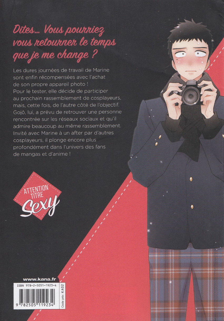 Résumé: Les dures journées de travail de Marine sont enfin récompensées avec l'achat de son propre appareil photo ! Pour le tester, elle décide de participer au prochain rassemblement de cosplayeurs, mais, cette fois, de l'autre côté de l'objectif. Gojô, lui, a prévu de retrouver une personne rencontrée sur les réseaux sociaux et qu'il admire beaucoup, au même rassemblement. Invité avec Marine à un after par d'autres cosplayeurs, il plonge encore plus profondément dans l'univers des fans de mangas et d'anime !