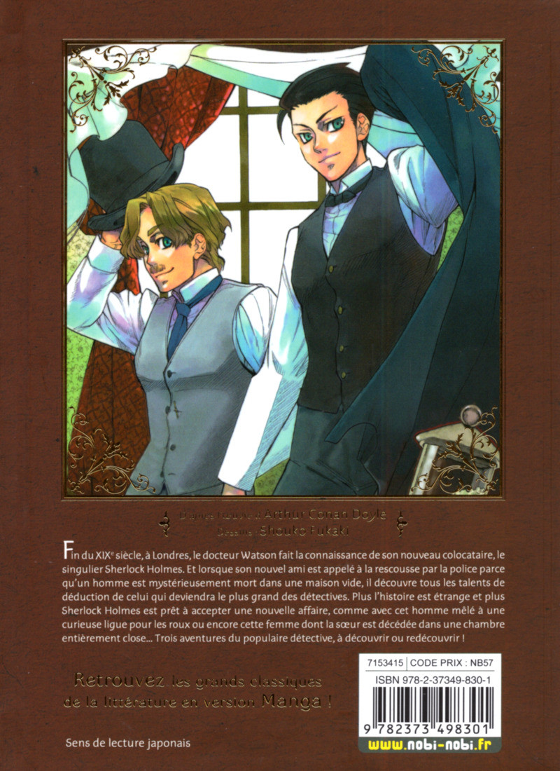 Résumé: Fin du XIXe siècle, à Londres, le docteur Watson fait la connaissance de son nouveau colocataire, le singulier Sherlock Holmes. Et lorsque son nouvel ami est appelé à la rescousse par la police parce qu'un homme est mystérieusement mort dans une maison vide, il découvre tous les talents de déduction de celui qui deviendra le plus grand des détectives. Plus l'histoire est étrange et plus Sherlock Holmes est prêt à accepter une nouvelle affaire, comme avec cet homme mêlé à une étrange ligue pour les roux ou encore cette femme dont la soeur est décédée dans une chambre entièrement close...Trois aventures du populaire détective, à découvrir ou redécouvrir ! Retrouvez les grands classiques de la littérature en version Manga !