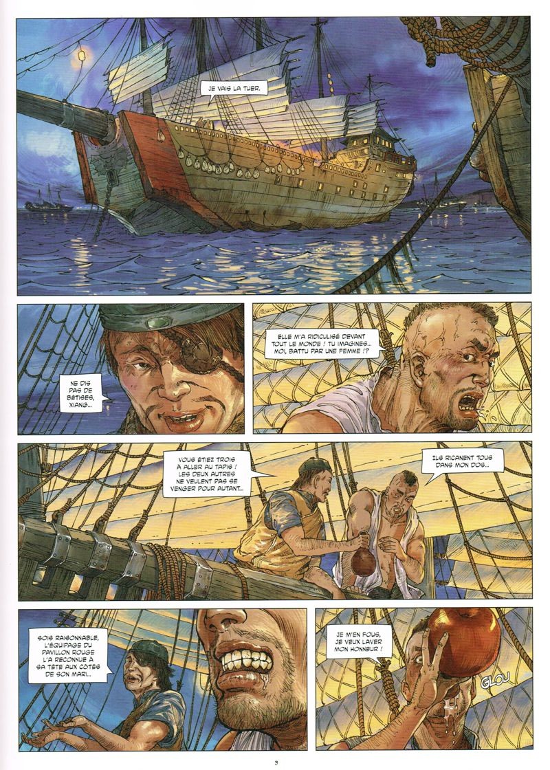 Ce deuxième épisode des aventures de Shi Xiu, personnage historique devenu une légende, confirme la bonne impression laissée par le premier opus. Après avoir décrit comment elle réussit à échapper à sa condition de courtisane, l’auteur s’attache ici à dévoiler les qualités de stratège et d’organisatrice de la belle et redoutable jeune femme. Contrairement aux pirates dont la vision s’arrête au prochain pillage et au partage du butin, elle se projette à long terme et va chercher à renforcer la flottille des forbans en les structurant autour d’un code de piraterie. Dans le même temps, elle renforce son réseau d’indicateurs et œuvre à ménager le bas peuple afin de pouvoir recruter des forces vives.
