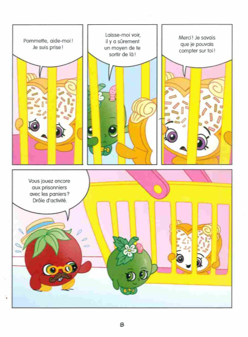 Album BD mettant en scène les petites mésaventures, d'une page à la fois, des personnages vedettes des Shopkins, ces aliments et produits variés humanisés vendus au supermarché.