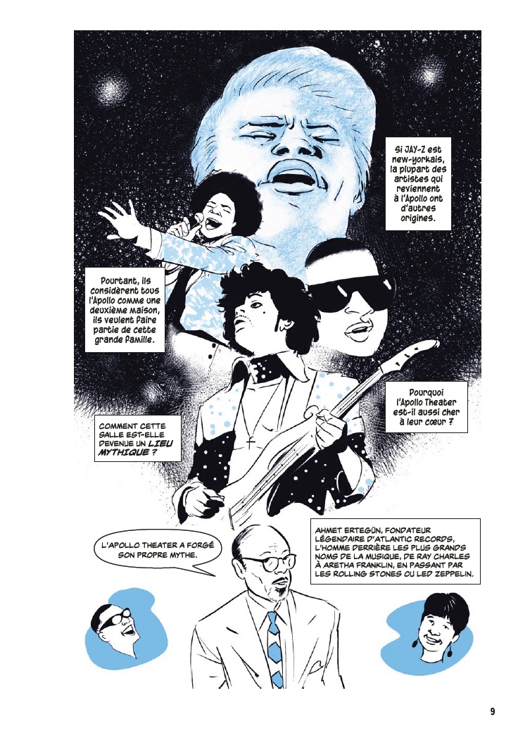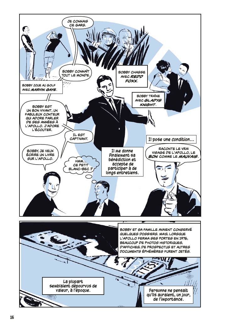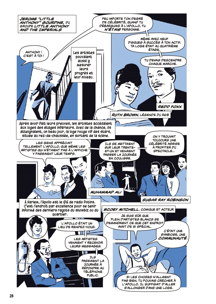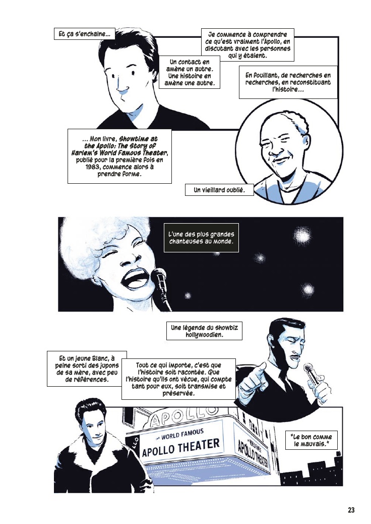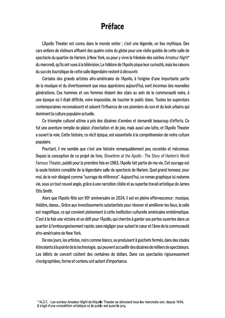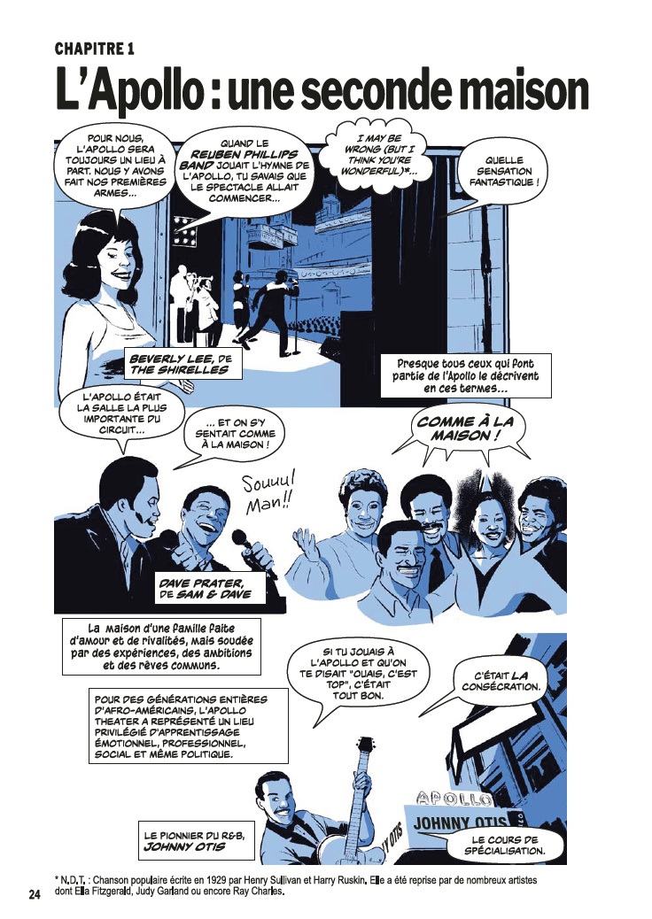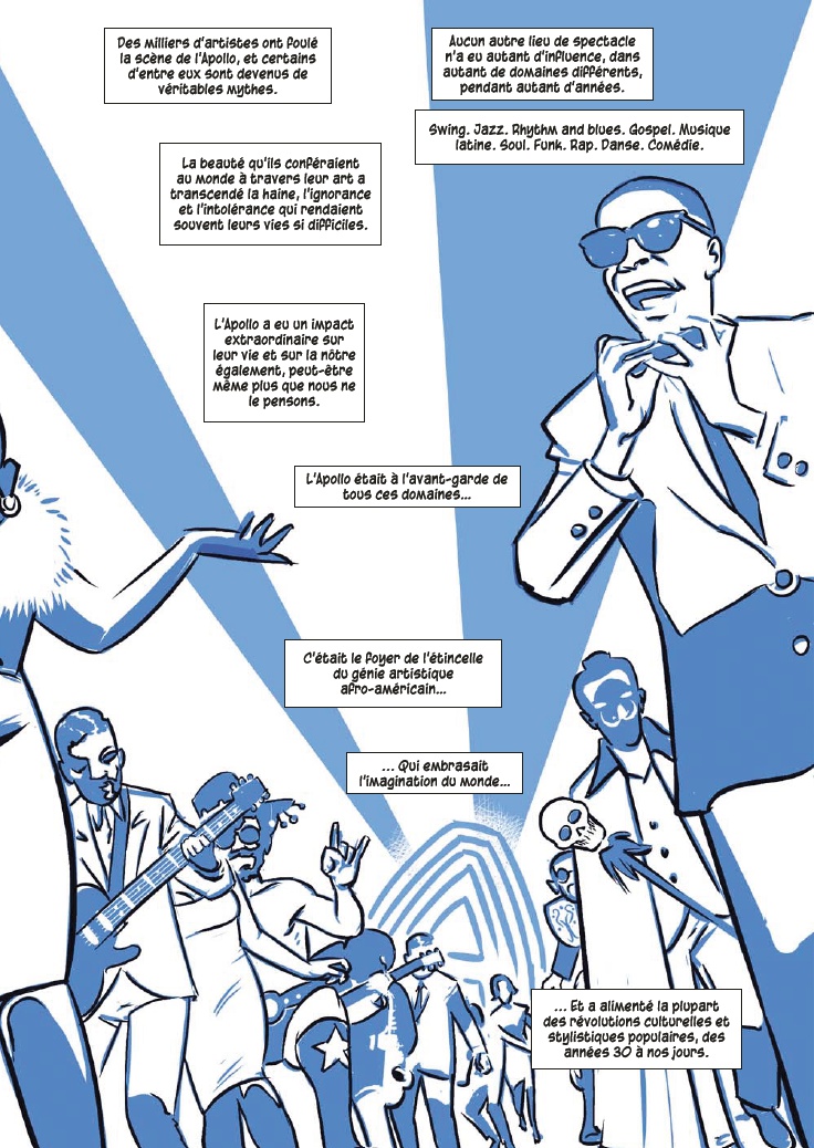 Avec l’aide de James Otis Smith aux pinceaux, Ted Fox revisite et actualise son ouvrage référence paru en 1983 avec Show Time at the Apollo. Jeune homme passionné d’histoire, il avait été le premier à s’intéresser à ce sujet, à une époque où celui-ci était tombé en décrépitude. À force de fouiner et de rencontrer d’anciens artistes, il a commencé à réaliser que l’auditorium était un endroit spécial, tant pour les musiciens, que pour le public et la société civile. Après des mois d’enquêtes et d’innombrables interviews, son livre avait fait date. Depuis, grâce à des mécènes aux poches profondes, l’Apollo a connu une énième renaissance et continue d’être en activité.