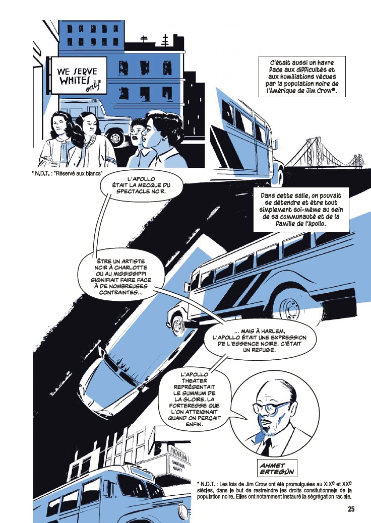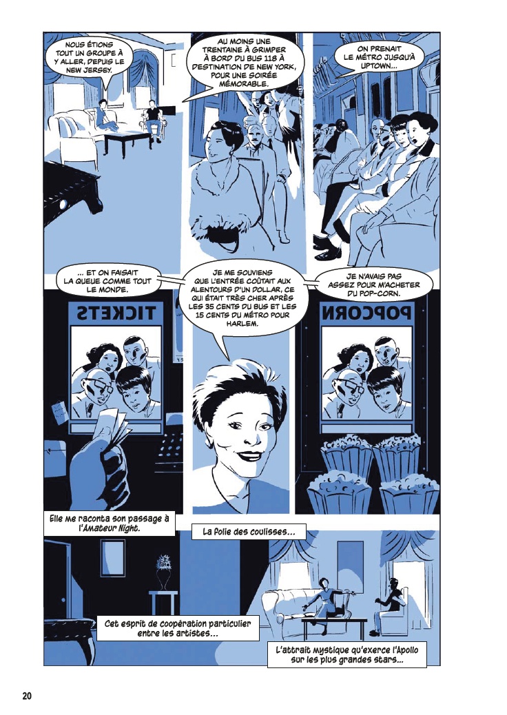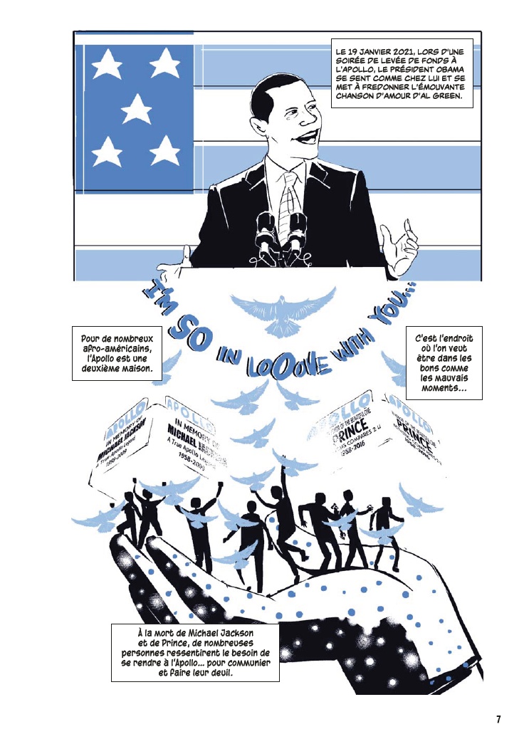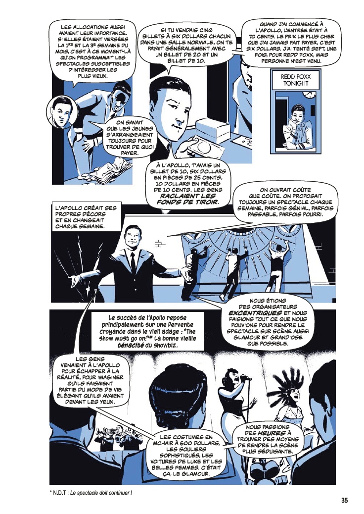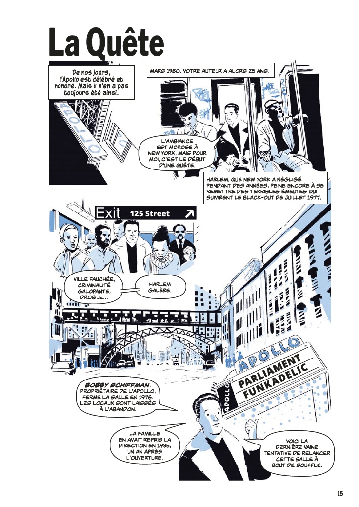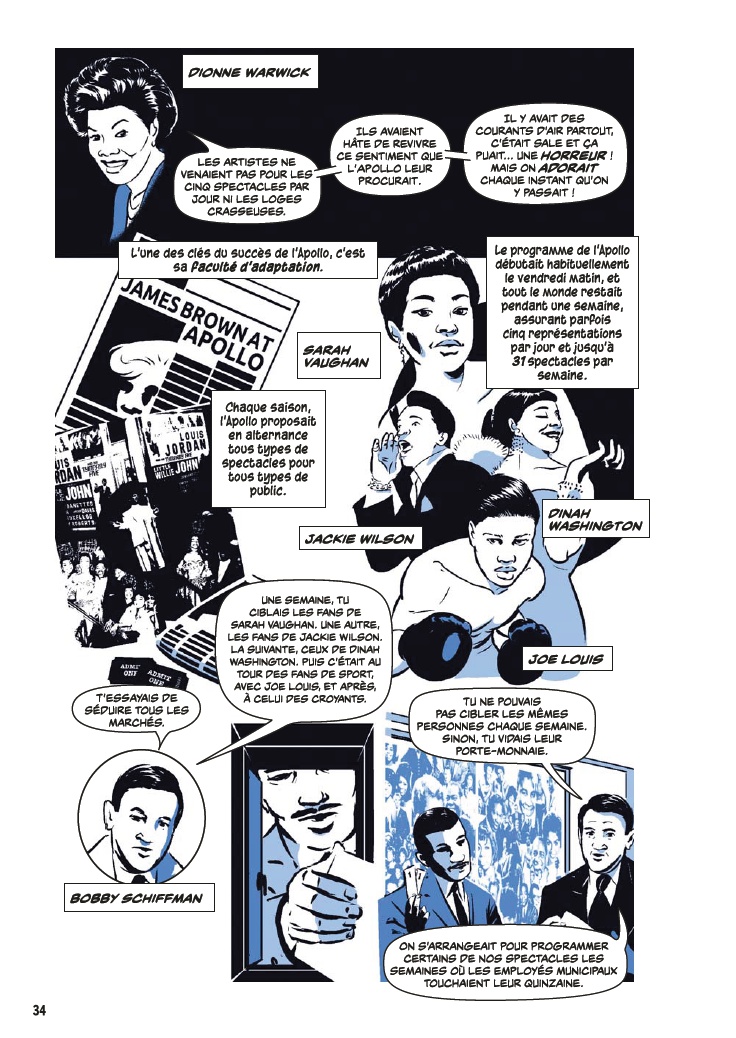 Avec l’aide de James Otis Smith aux pinceaux, Ted Fox revisite et actualise son ouvrage référence paru en 1983 avec Show Time at the Apollo. Jeune homme passionné d’histoire, il avait été le premier à s’intéresser à ce sujet, à une époque où celui-ci était tombé en décrépitude. À force de fouiner et de rencontrer d’anciens artistes, il a commencé à réaliser que l’auditorium était un endroit spécial, tant pour les musiciens, que pour le public et la société civile. Après des mois d’enquêtes et d’innombrables interviews, son livre avait fait date. Depuis, grâce à des mécènes aux poches profondes, l’Apollo a connu une énième renaissance et continue d’être en activité.