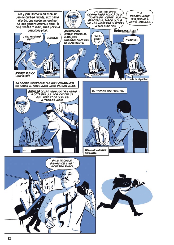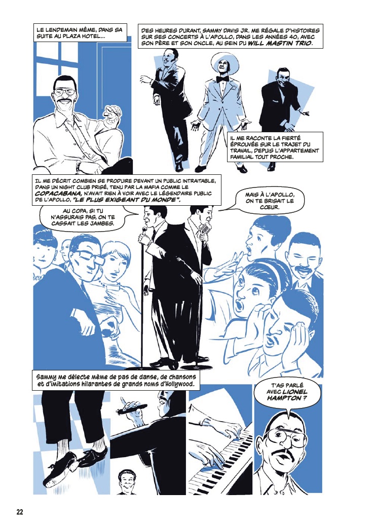 Ouvrage florissant, l’album rassemble un siècle d’anecdotes dans un maelstrom dessiné pas toujours maîtrisé, malheureusement. Vaguement chronologique, la narration saute du coq à l’âne à tout instant, présente une avalanche ininterrompue de témoins, cite des chansons connues ou oubliées et coince à tout prix ses sources là où il reste un petit peu de place. De plus, comme la caricature n’est pas le point fort du dessinateur, les visages et les attitudes des différents protagonistes, même les plus célèbres, ne sont guère reconnaissables. Pour faire simple, tel un solo de John Coltrane en fin de carrière, le résultat s’avère irrespirable et, plus grave, presque illisible. Pourtant, quelle richesse thématique et quelle importance historique !