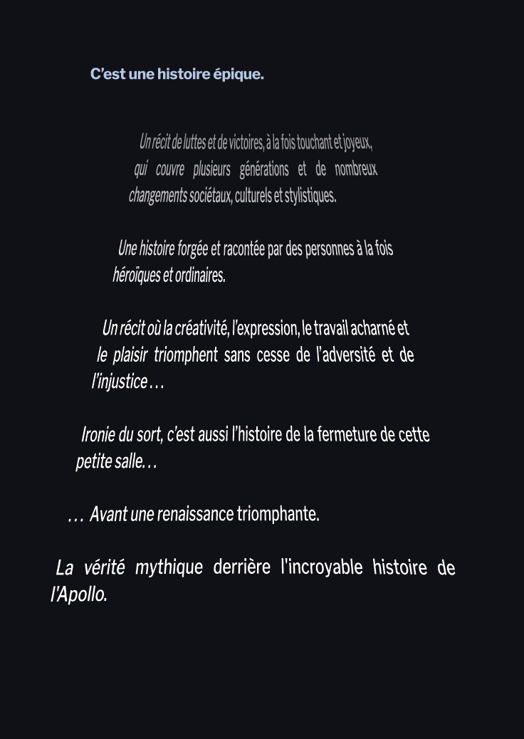 e Budokan, l’Olympia, le Whisky a Go Go, il y a des salles de spectacles dont la seule évocation suffit à faire tourner les têtes des amateurs de musique : concerts mythiques, endroits-clefs où de nouveaux sons ont été entendus pour la première fois ou, plus dramatiquement, lieux d’incidents tragiques restés dans toutes les mémoires. Situé au cœur d’Harlem à New York, The Apollo est peut-être la plus emblématique de ces scènes. En presque cent ans d’existence, du proto-jazz hérité du ragtime au rap, en passant par les big bands, le jazz, la soul, le R&B et le funk, une bonne partie de la musique noire nord-américaine a résonné dans ses murs. Plus largement et socialement, ce théâtre est également un symbole majeur des combats des afro-américains pour les Droits Civiques et l’égalité.