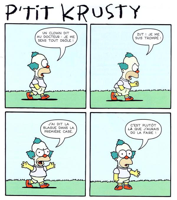 Résumé: Krusty le clown méritait bien qu'on lui consacre un livre. Ce personnage aux multiples facettes est le héros de Bart et de tous les enfants de Springfield. Génie comique et légende de la télé pour les uns, fraudeur fiscal, père irresponsable, joueur compulsif et analphabète notoire pour les autres, qui est vraiment l'homme qui se cache derrière le maquillage et les tartes à la crème ? Cet as du marketing vous dévoilera ses secrets et vous apprendra l'art et la manière de s'approprier les blagues des autres. Ou encore, comment échapper aux paparazzi, à la police, à la mafia. Des révélations "krustyllantes" à toutes les pages ! Entrez dans l'univers de Krusty et profitez du spectacle !