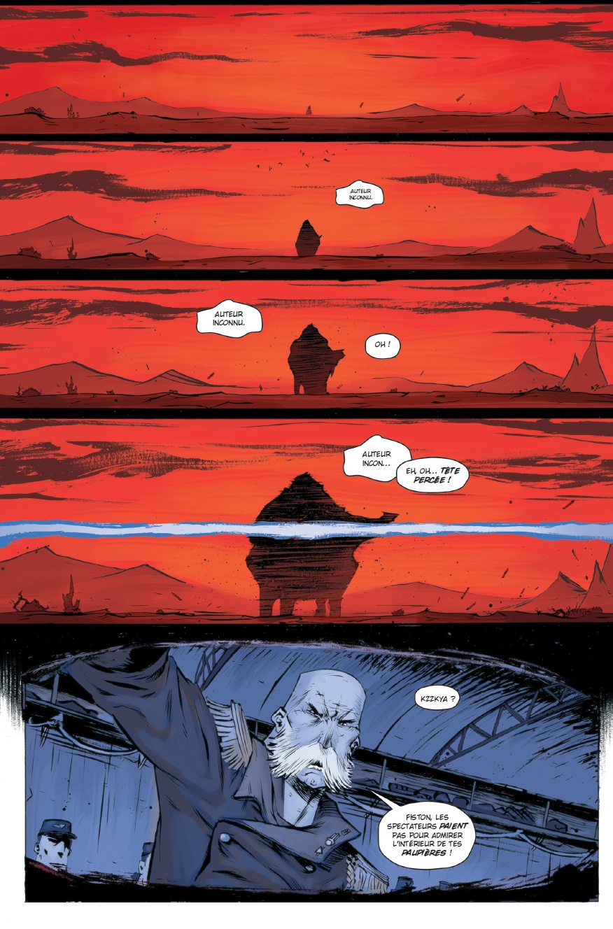 Tout droit sortit de nulle part, ce one shot de Simon Spurrier et Jeff Stokely (tous deux quasi-inconnu-au-battaillon) nous ait offert par Ankama (originalement publié par l'éditeur indépendants Boom studios !). Autant vous dire tout de suite que la lecture a été une surprise totale, et ce malgré les congratulations endiablés des critiques. Six-Gun Gorilla nous entraîne dans un univers rétro-futuriste à la croisés des genres en pleine guerre civile sur un champ de bataille des plus étranges : le "Blister". Au sein même de cette guerre, une émission de télé-réalité s'est construite grâce à une caméra implanté dans l'orifice droit des volontaires matriculé les "bleus" servant de chair à canon dans l'effort de guerre et de divertissement pour les télé-spectateurs. Nous suivons donc l'histoire du matricule Bleu-3425 à partir de son débarquement où commence son périple en compagnie d'un gorille tonitruant à la gâchette facile. L’histoire s’enchaîne de plus belle dans le Blister, où de nombreux personnages secondaires charismatiques feront leur entré. La découverte et l'étude du Blister est des plus incroyables, car on se rend vite compte que ce lieu n'a rien de rationnel, mais ce serait un crime de vous dévoiler ses secrets. Concernant le fond en lui-même, il est des plus déroutant. Véritable hommage aux histoires originales et aux auteurs inconnus dans cet univers de science-fiction / anticipation / western aux abords psychédéliques qui fait office de critique de l'époque contemporaine et de la déchéance de l'humanisme dans la surconsommation. Quant au dessin, malgré un début qui peut laisser de marbre, on se laisse facilement imprégner de l'ambiance far-west / futuriste, avec des traits qui rappellent beaucoup Sean Murphy. Pour résumé, Six-Gun Gorilla nous propose une histoire et un univers extrêmement bien pensé, un graphisme fluide et très joli, des personnages charismatiques, un humour efficace, un fond d'une richesse inimaginable pour ceux qui ne l'ont pas lus. Autant l'avouer, Six-Gun Gorilla est une réussite à tout les niveaux, d'autant plus qu'il fait l'objet d'une surprise totale, vu le peu de chance qu'il arrive dans nos contrées. Indispensable et très certainement futur candidat aux Eisner, Harvey et Eagles 2015Le 07/06/2015 à 17:50:05