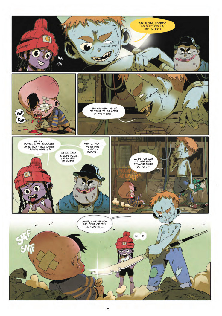 L'histoire est à l'image de la couverture : couleurs pétantes et trait rond pour dépeindre un univers dur, où le danger est partout. Désœuvrés et livrés à eux-mêmes, ses héros évoluent dans un monde violent où tous les coups pour survivre sont permis. Et tandis que Eingyi n'a que sa rage et sa batte pour répondre aux agressions dont le trio est victime, Bambi, plus âgée, cherche à sortir la petite bande de cette situation en brisant cette spirale.