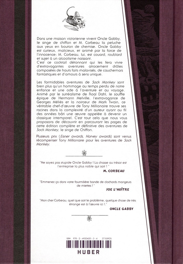 Résumé: Après Billy Noisettes, ouvrage présent dans la sélection du FIBD 2020, HUBER enfonce le clou et publie SOCK MONKEY, l'intégrale des aventures d'un singe de chiffon, publiées aux USA depuis la fi n des années 90. On y suit les pérégrinations d'Oncle Gabby et ses amis, des jouets d'enfant ayant pris vie pour enfoncer la porte de l'imaginaire et foncer dans des péripéties aussi folles les unes que les autres ! Toujours aussi enlevé, le pied au plancher et les doigts dans la prise, Tony Millionaire présente avec cet album la quintessence de tout son savoir-faire.