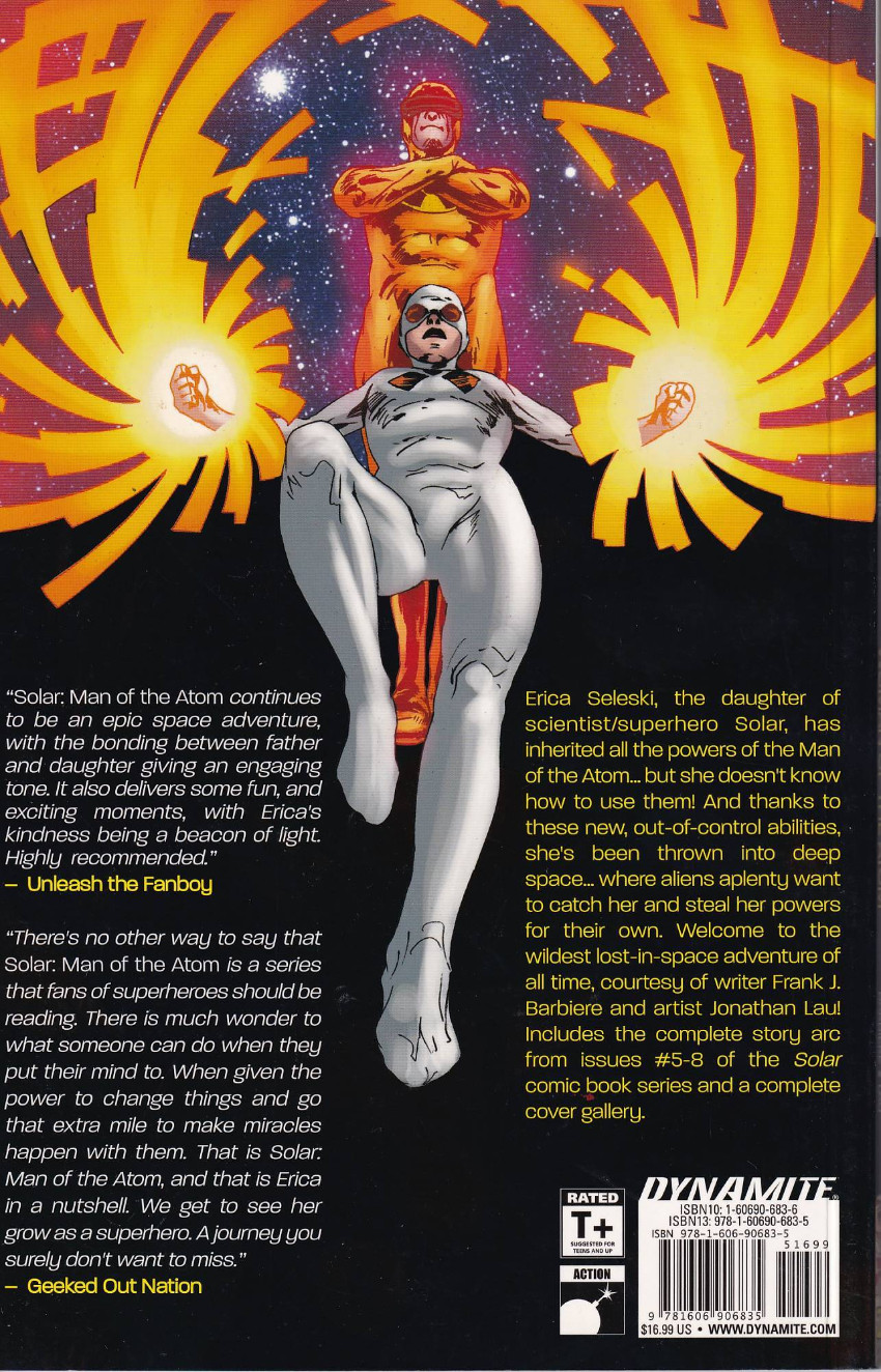Résumé: Erica Seleski, the daughter of scientist/superhero Solar, has inherited all the powers of the Man of the Atom... but she doesn't know how to use them! And thanks to these new, out-of-control abilities, she's been thrown into deep space... where aliens aplenty want to catch her and steal her powers for their own. Welcome to the wildest lost-in-space adventure of all time, courtesy of writer Frank J. Barbiere and artist Jonathan Lau!
