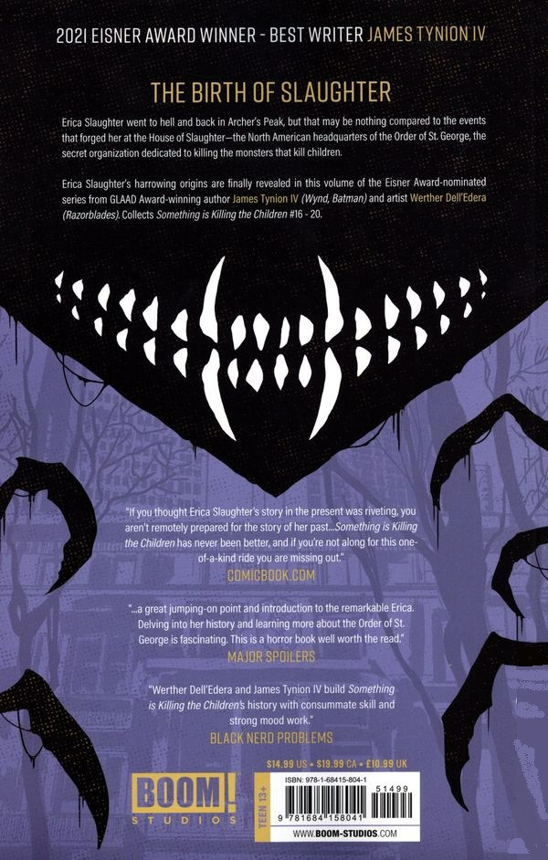 Résumé: Erica Slaughter went to hell and back in Archer’s Peak, but that may be nothing compared to the events that forged her at the House of Slaughter. What events brought Erica to the House of Slaughter? And what did she have to do to join the Order of St. George? Erica Slaughter’s origins are finally revealed in this volume of the Eisner Award-nominated series from GLAAD Award-winning author James Tynion IV (The Woods, Batman) and artist Werther Dell’Edera (Razorblades). Collects Something is Killing the Children #16-20.
