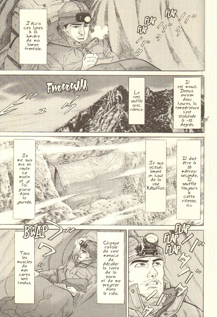 A l’aide de paysages de montagne impressionnant Taniguchi parvient à décrire avec suspens le combat de ces deux héros face aux sommets du monde et dissipe tout doucement la brume qui entoure le passé de Habu Jôji. Fabuleux !