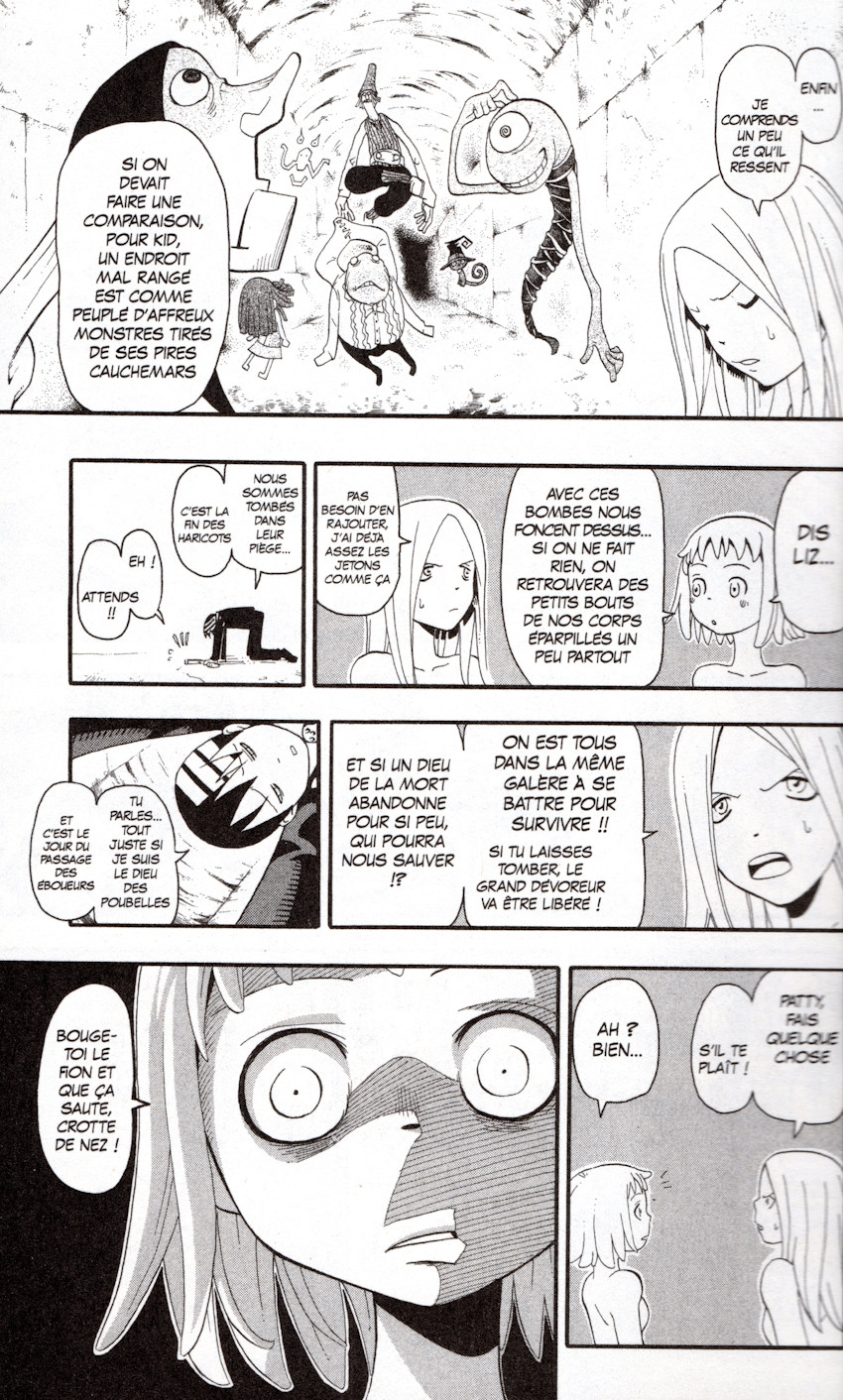 Le sixième volume de la saga "Soul Eater" poursuit sur l'excellente lancé du précédent : tandis que l'affrontement dantesque entre élèves et professeurs de l'école d'un côté, et sorciers et forces du mal d'un autre, se poursuit dans les sous-sols de la ville, Ohkubo continue à tester comme un malade des formes narratives et graphiques les plus audacieuses possibles : on n'oubliera pas de sitôt la représentation ultra-simple mais puissante de la schizophrénie de Crona enfant, sans doute le plus beau moment du livre. On appréciera aussi l'inventivité formelle éblouissante lors du combat final entre Shinigami et le Grand Dévoreur, d'un formidable dynamisme (sans oublier l'humour potache de Ohkubo, jamais en manque de blagues vaseuses pour désamorcer le sérieux de n'importe quelle situation…). A la fin de ce volume, comme dans Harry Potter encore une fois, Ohkubo nous agite la promesse d'un conflit ayant largement débordé les limites géographiques de l'école des "Death scythes", et on en salive d'avance...BDGest 2014 - Tous droits réservés