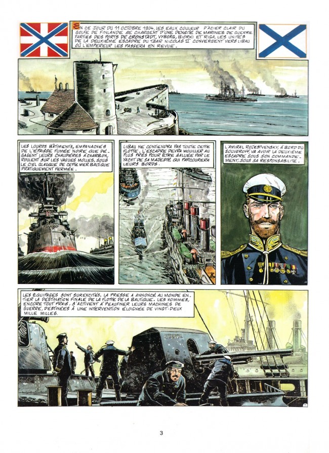 Sous le pavillon du Tsar nous entraîne dans une bataille navale opposant les forces russes aux japonais qui venaient de leur infliger une cuisante défaite à Port-Arthur. L'Histoire retiendra que c'est la première véritable défaite de l'époque moderne des Occidentaux contre une nation dite "indigène".