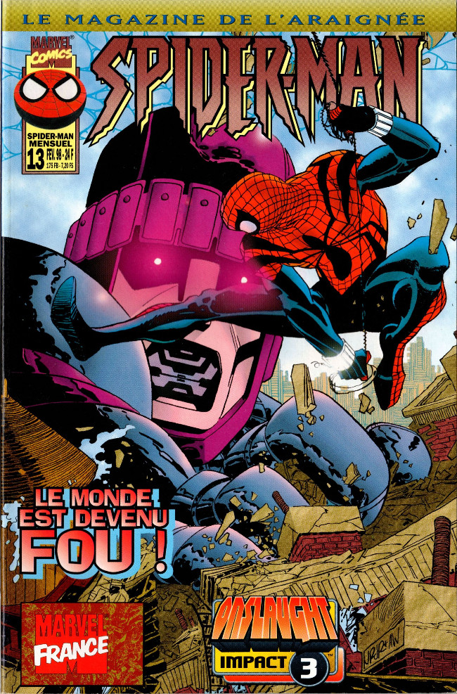 - Résumé: Contient: - Sensational Spider-man (I) 08 "The usual suspects" (Sensational Spider-man (I) 08 "The Usual Suspects" 09/1996). - Amazing Spider-man (I) 415 "Robots sur la ville" (Amazing Spider-man 415 "Onslaught Impact 2: The Sentinels Take Manhattan!" 09/1996). - Spider-man (I) 72 "Le monde est devenu fou!" (Spider-man (I) 72 "Onslaught Impact 2: The World's Gone Mad!" 09/1996). - Amazing Spider-man (I) 413 "Bug Story" (Amazing Spider-man 413 " From Darkness Strikes -- Delilah!" 07/1996).