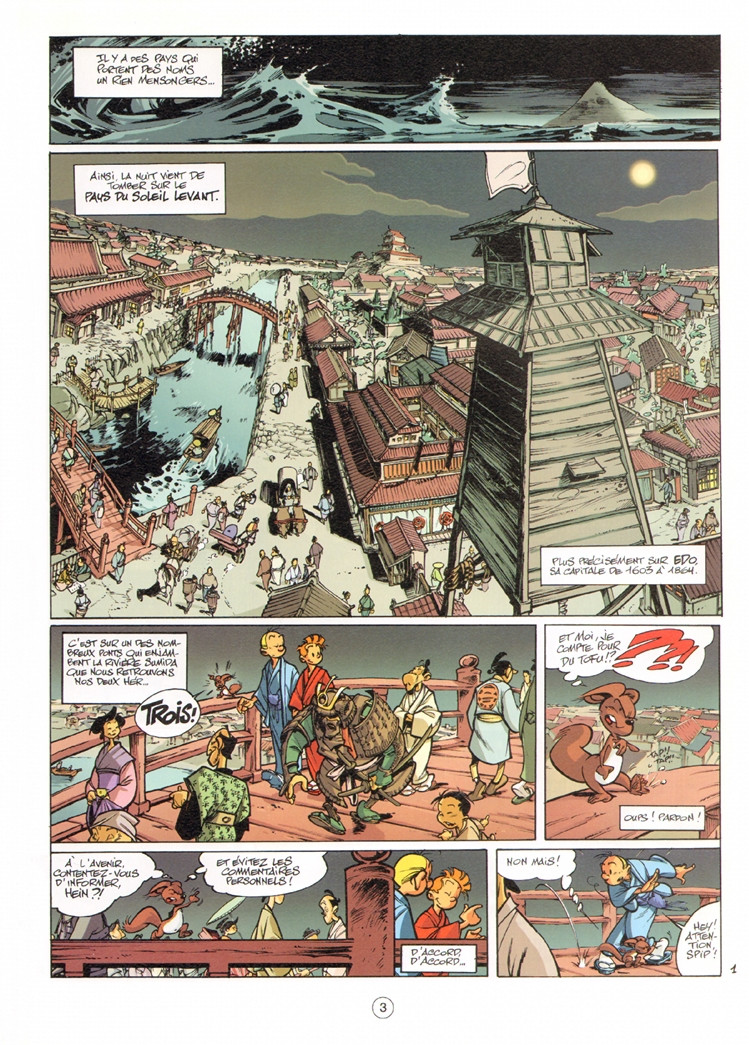 Résumé: Nous retrouvons Spirou, Fantasio et Spip à Edo, capitale du Pays du Soleil Levant, de 1603 à 1864. Paradoxe temporel ? Voyage dans le temps ? Rien de tout ça : nos trois amis sont tout simplement invités à la prestigieuse inauguration de "Edo-resort", un gigantesque parc d'attractions qui reconstitue très fidèlement la vie du Japon médiéval. Mais Spirou et ses compagnons ne sont pas là pour le plaisir. Ils sont venus en Extrême-Orient à la demande de leur ami magicien, Itoh Kata, qui leur a confié une mission spéciale : récupérer deux enfants aux pouvoirs paranormaux étonnants qui sont détenus par Mangakana, un redoutable gangster aux ambitions immobilières troubles. Une course-poursuite va mener nos trois héros d'Akihabara, le quartier électronique, à Giza, celui des spectacles, en passant par Shinjuku, le territoire des redoutables yakuza, pour une visite guidée particulièrement mouvementée. Ce 49e album des aventures de « Spirou et Fantasio » est le troisième du duo Morvan-Munuera. Morvan s'est fait plaisir en situant l'histoire en plein Tokyo, ville qu'il connaît parfaitement pour s'y rendre régulièrement. Idéal donc pour faire visiter les quartiers les plus pittoresques à nos deux héros. Quant à Munuera, le dynamisme de son trait illustre au mieux cette histoire pleine de rebondissements et de surprises.
