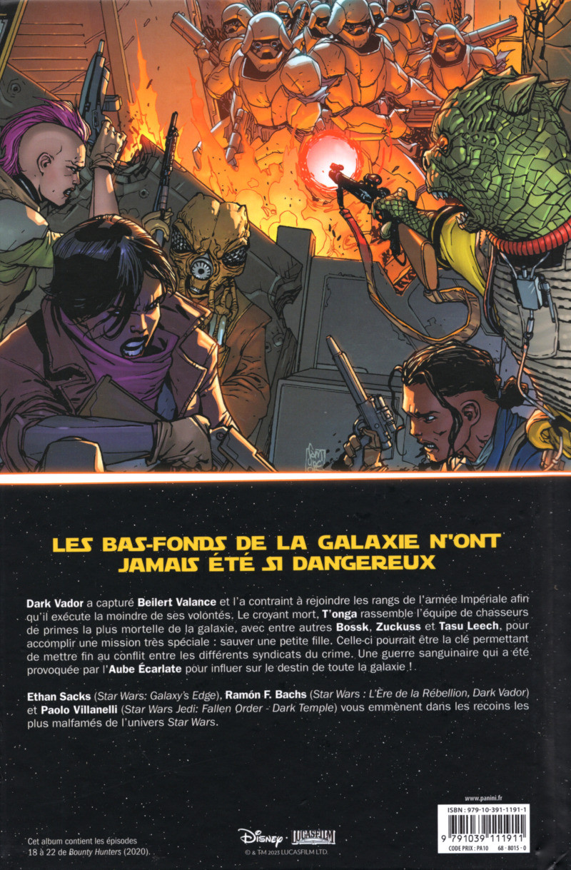 Résumé: Après les évènements de War of the Bounty Hunters, l'Aube Écarlate entraîne la galaxie dans le chaos pour déstabiliser l'Empire. C'est dans ce contexte explosif que T'onga réunit autour d'elle une incroyable équipe de chasseurs de primes pour réaliser une mission quasi impossible. Mais pour mener à bien leur quête pleine de violence, les mercenaires vont tout d'abord commencer par une mission de sauvetage... Ethan Sacks (Halcyon Legacy, Galaxy's Edge) poursuit sa grande saga sur les personnages secondaires de l'univers Star Wars. Les chasseurs de primes inventés pour l'occasion, ou découverts dans L'Empire Contre-attaque, sont des anti-héros à qui il peut tout arriver, ce qui donne lieu à des histoires pleines de rebondissements et de trahisons.