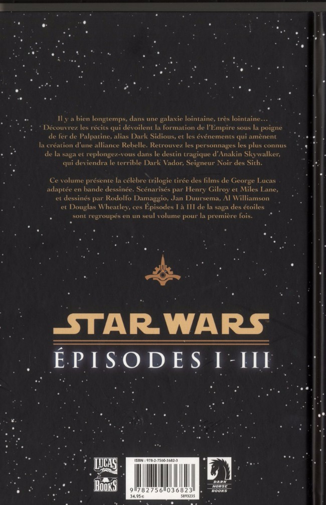 Résumé: Il y a bien longtemps, dans une galaxie lointaine, très lointaine... L'intégralité des Épisodes I à III de la saga Star Wars présentée pour la première fois dans un même volume et dans un format inédit. (Re)découvrez le destin d'Anakin Skywalker, son amour passionné pour la reine Amidala et son insatiable soif de pouvoir qui le feront basculer vers le Côté Obscur.
