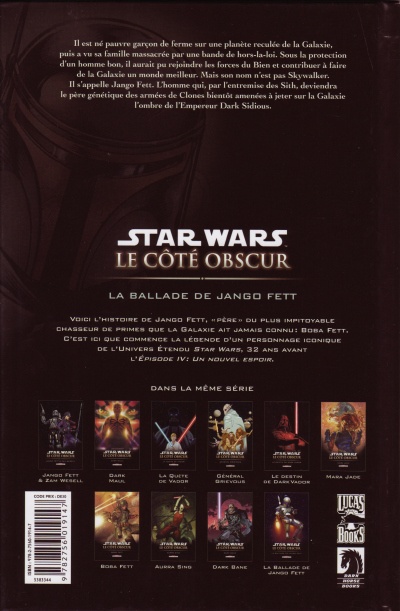 Résumé: Il est né garçon de ferme sur une planète reculée et a vu sa famille massacrée. Sous la protection d'un homme bon, il aurait pu rejoindre les forces du Bien. Mais son nom n'est pas Skywalker. Il s'appelle Jango Fett, père du plus impitoyable chasseur de primes que la Galaxie ait jamais connu : Boba Fett. C'est ici que commence la légende d'un personnage iconique de l'Univers Étendu Star Wars.