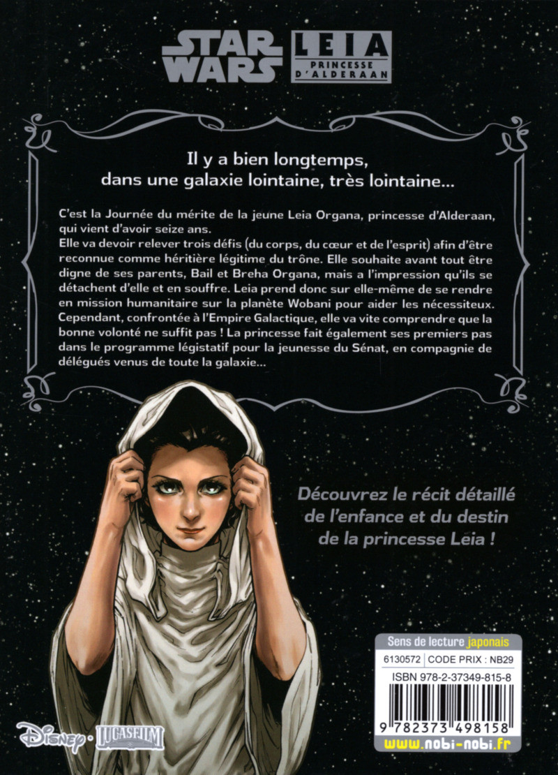 Résumé: C'est la Journée du mérite de la jeune Leia Organa, princesse d'Alderaan, qui vient d'avoir seize ans.Elle va devoir relever trois défis (du corps, du coeur et de l'esprit) afin d'être reconnue comme héritière légitime du trône. Elle souhaite avant tout être digne de ses parents, Bail et Breha Organa, mais a l'impression qu'ils se détachent d'elle et en souffre. Leia prend donc sur elle-même de se rendre en mission humanitaire sur la planète Wobani pour aider les nécessiteux. Cependant, confrontée à l'Empire Galactique, elle va vite comprendre que la bonne volonté ne suffit pas ! La princesse fait également ses premiers pas dans le programme légistatif pour la jeunesse du Sénat, en compagnie de délégués venus de toute la galaxie...Découvrez le récit détaillé de l'enfance et du destin de la princesse Leia !