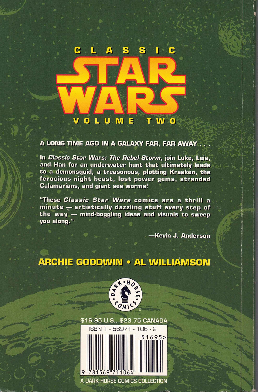 Résumé: There was no peace for the crewmembers of the Millennium Falcon between Star Wars and The Empire Strikes Back! Follow their adventures as they plunge head first into an underwater hunt that leads to a demonsquid, a treasonous and plotting Kraaken, the ferocious night beast, lost power gems, stranded Calamarians, and giant sea worms! Will the depths of the oceans spell defeat for the Rebels, or will they emerge victorious? From 1981 to 1984, comic-book greats Archie Goodwin and Al Williamson created a popular series of Star Wars newspaper strips which are science fiction adventure at its best! Dark Horse has reformatted those strips to make them work as a continuous comic-book story, with Al Williamson returning to redraw and extend many panels for this new format. The package also includes an introduction by Star Wars novelist Kevin J. Anderson.