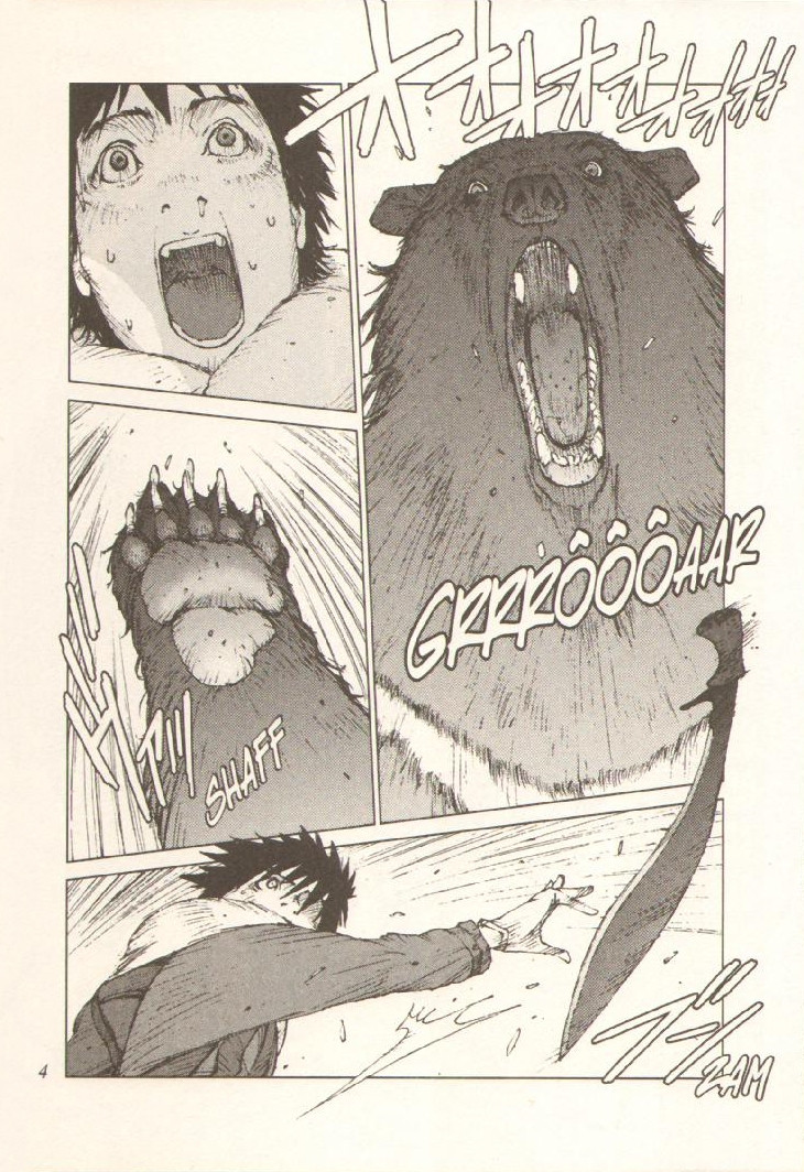 Résumé: Satoru souffre de la faim et de la soif, il s’organise pourtant, grâce à ses souvenirs, il fabrique de l’eau, affine une technique de pèche. Mais le danger rodant est toujours là. L’ours sur son territoire cherche lui aussi sa pitance, et satoru est une victime toute désignée.
