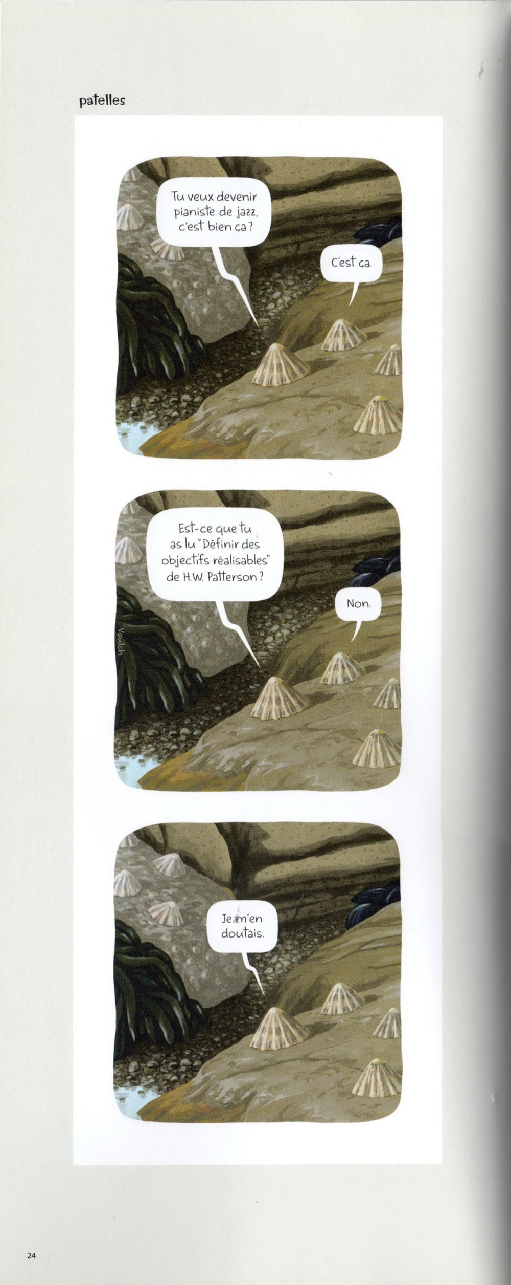 Basé sur des strips à images répétées, comme ceux de Fabcaro, Emmanuel Reuzé ou autres. Sauf qu'ici les sujets ne sont pas des humains mais des organismes anodins (comme des brins d'herbe, des vers de vase, voire des bouses de vaches) ou des objets courants (tire-bouchon, bouton de porte...). Le tout avec un dessin raffiné en couleur. Et un humour non-sens. J'ai beaucoup apprécié. Autant si pas plus que les précités.