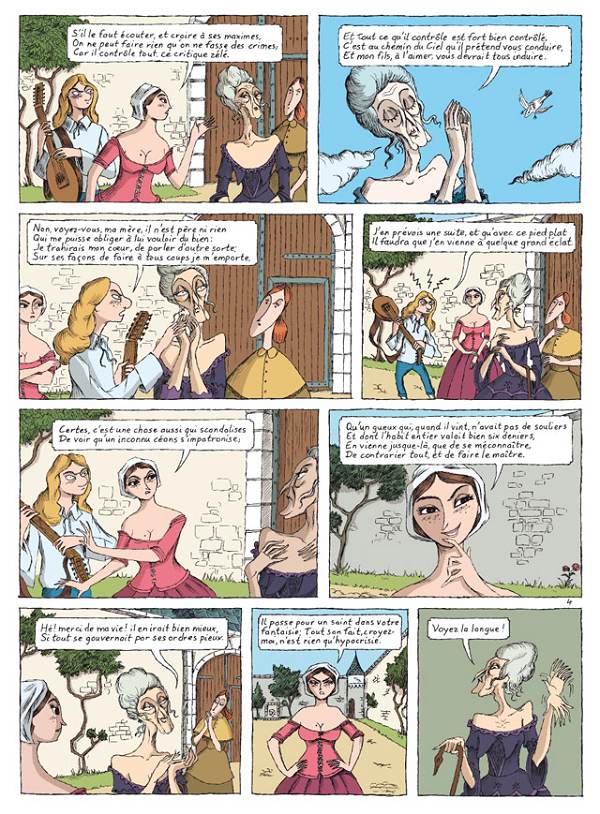 Fred Duval a choisi de découper Tartuffe en trois albums, reprenant respectivement les actes I et II, les III et IV et enfin le cinquième. Comme toute bonne pièce, ce premier volet plante le décor, les personnages et les enjeux, à savoir sauver l’idylle de Mariane et Valère, démasquer le faux dévot et, ce faisant, ramener Orgon à la raison. Soulignons que, s’il n’est question que de lui, Tartuffe n’est pas encore intervenu et n’apparaît dans les planches que pour illustrer les propos rapportés à son encontre. Il n’entrera en scène qu’au troisième acte, c'est-à-dire dans le prochain volume. Par ailleurs, le texte de Molière est fidèlement restitué, ce qui est un indéniable avantage puisque cela permet de le (re)découvrir et de le savourer autrement qu’en le voyant jouer. Néanmoins, certains lecteurs auront peut-être quelques difficultés avec le langage du XVIIe siècle et les alexandrins, qu’ils trouveront ardus ou qui leur rappeleront de douloureuses heures d’étude au collège. Toutefois, c’est le graphisme de Zanzim qui confère tout son charme à l’ouvrage. Apparenté à celui d’un Blain, il est expressif et transmet bien les émotions des protagonistes, qui semblent porter leur caractère sur leur visage. Jouant sur les différents décors, à l’intérieur de la maison, mais également en dehors (dans la rue, le long d’une rive, au bal), il permet de créer une véritable ambiance et de trancher avec la monotonie d’un seul et unique lieu. Certains détails ne manquent pas de piquant et prêtent à sourire comme cette assiette redécorée par Dorine pour former une tête à la Arcimboldo, ou cet écriteau intitulé « entreprise André Le Nôtre », ou encore ce passage où Orgon paraît couronné de bois de cerf tandis que sa servante lui expose le risque que Mariane cocufie un mari qui ne lui convient pas.