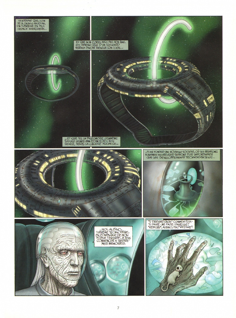 Moi, Albino, Suprême Technopère, j’emmène 500.000 jeunes pan-technos des deux sexes vers la galaxie promise, loin de la galaxie maudite. Mon corps est devenu celui d’un vieillard, mais pas mon âme… Mon histoire commence quand Oulrij-le-Rouge attaqua l’astéroïde sacré où on cachait Panépha, ma future mère, jeune vierge, de beauté légendaire, destinée à être l’oracle de la Maison impériale. Les pirates éliminèrent les gardes impériaux et détruisirent le temple. Ce jour-là, Panépha fut violée par les soixante pirates… Critique : J’avoue tout : les délires d’Alexandro Jodorowski m’ont quelque peu égaré, au point qu’il m’aura fallu une vingtaine d’années entre l’achat et la lecture complète de cette BD, achetée essentiellement pour son caractère graphique, la couverture de Fred Beltran ayant été déterminante dans l’acte d’achat, ainsi que le graphisme du dessinateur Zoran Janjetov que je trouvais exceptionnel pour l’époque. Je n’ai pas vraiment accroché à l’histoire qui est assez tirée par les cheveux : des humains vivant dans l’espace sans scaphandre… Des personnages plus proches des comics américains façon super héros… Du Camenvert… Le fromage produit par une prêtresse violée pour s’en sortir afin de prendre sa revanche sur le destin… On le sait, Jodorowski a beaucoup d’imagination, mais je n’ai pas trouvé là ce qu’il fait de mieux. Après une petite vingtaine d’années, j’ai décidé de lire jusqu’au bout cette histoire qui a aucun moment ne m’a vraiment accroché.Le 23/04/2016 à 15:56:34