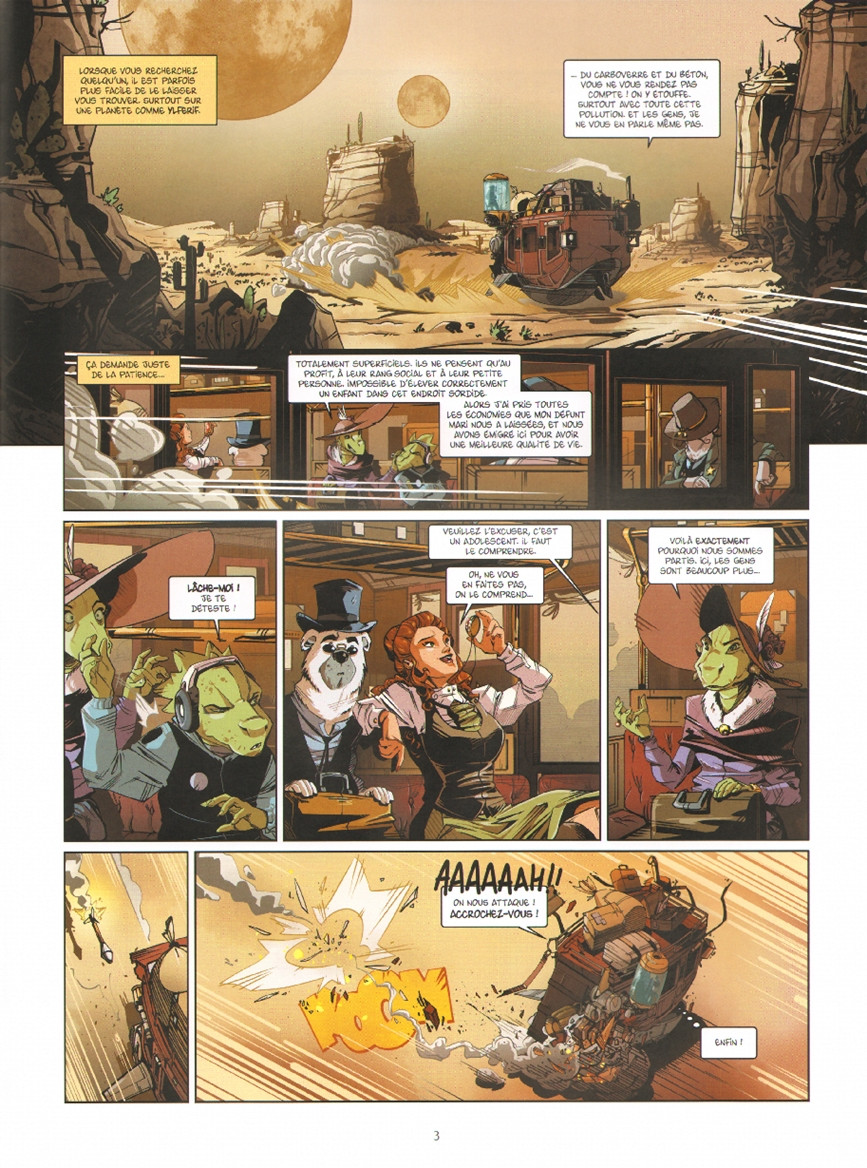 Au niveau du graphisme, j’ai juste eu l’impression que toutes les planches étaient noyées sous une couche épaisse de colorisation informatique comme pour masquer la faiblesse du trait.