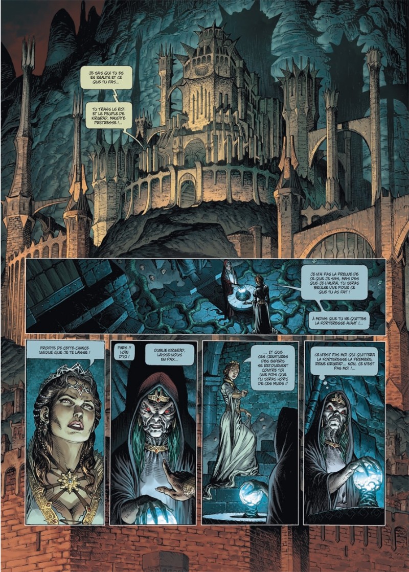 C’est tout d’abord le travail graphique attrayant des couvertures qui m’a convaincu de feuilleter Ténèbres chez Librairie 16. C’est juste magnifique et illustre parfaitement l’atmosphère d’Heroic-Fantasy que l’on retrouvera en parcourant les pages : guerriers aux parures énigmatiques, cités façonnées de bâtiments colossaux qui fourmillent de détails, marâtre perverse … mais surtout d’imposants dragons qui seront la menace permanente de ce récit. Donc une mise en forme détaillée comme par exemple l’introduction de l’architecture d’une ville sur 3 planches sans bulles, décrivant l’arrivée d’un messager. C’est fantastique et cohérent à la fois, de la pure magie. Un très beau dessin d’Iko donc qui peut rappeler certaines BD de Jean-Claude Gal, comme sa série « Arn ». La trame scénaristique de Bec reste assez classique au demeurant, pas de grosses surprises pour les aficionados de cet univers D’HF. Mais ça tourne suffisamment bien pour nous projeter dans les aventures du héro et rafraichir les souvenirs de nos années de rôlistes.