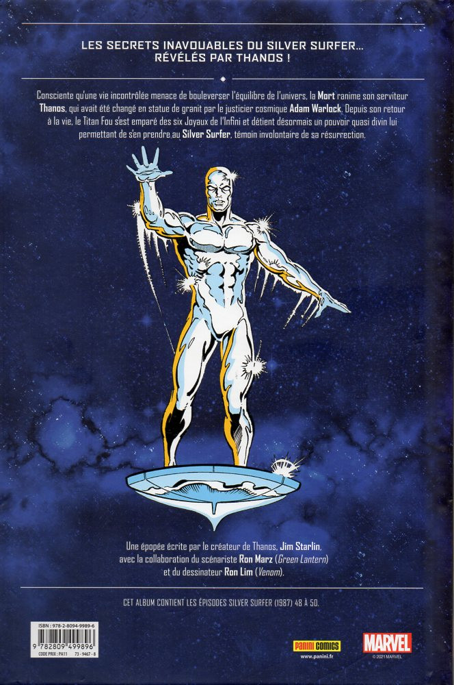 Résumé: Thanos est toujours à la recherche d'un moyen d'acquérir la puissance nécessaire pour attirer l'attention de sa bien-aimée, la Mort. Le Silver Surfer est seul face à lui, conscient du désastre que pourrait causer le Titan Fou. Pourra-t-il se résoudre à solliciter l'aide de son ancien maître Galactus, le Dévoreur de Mondes ?