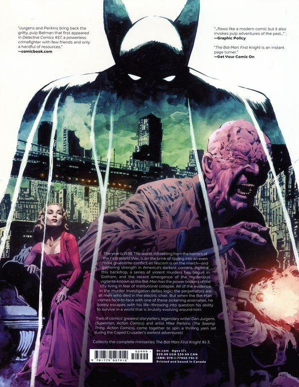 Résumé: The year is 1939. The world, still reeling from the horrors of the First World War, is on the brink of tipping into an even more gruesome conflict, as fascism is on the march-and gathering strength in America's darkest corners. Against this backdrop, a series of violent murders has begun in Gotham, and the recent emergence of the mysterious vigilante known as The Bat-Man has the power brokers of the city living in fear of institutional collapse. All of the evidence in the murder investigation defies logic: the perpetrators are all men who died in the electric chair. But when the Bat- Man comes face to face with one of these sickening anomalies, he barely escapes with his life-throwing into question his ability to survive in a world that is brutally evolving around him!