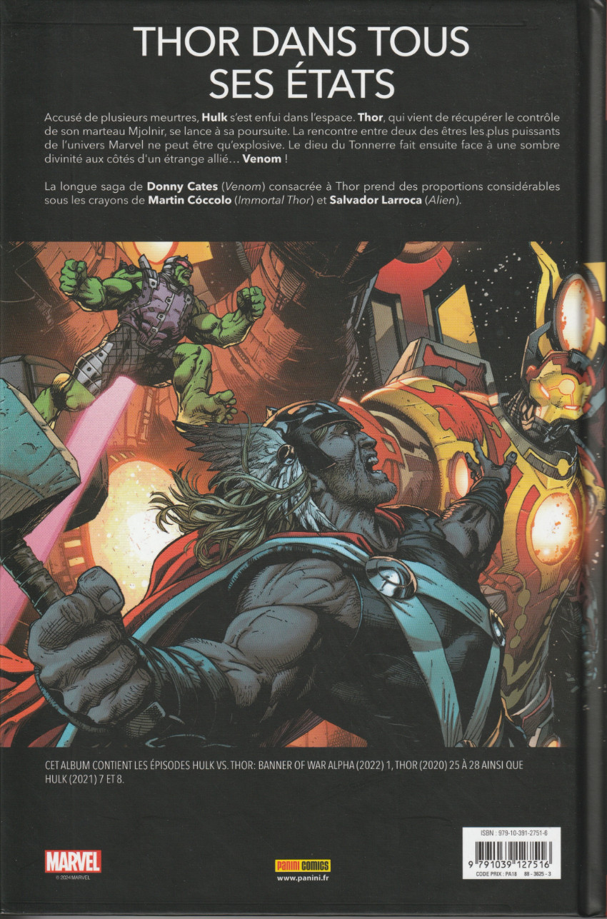 Info édition : Contient les épisodes US Hulk Vs. Thor: Banner of War Alpha (2022) 1, Thor (2020) 25-28 et Hulk (2021) 7-8, précédemment publiés dans 100% MARVEL : HULK/THOR et MARVEL COMICS 13, 15 et 19