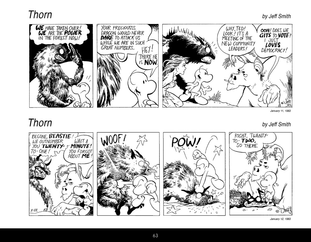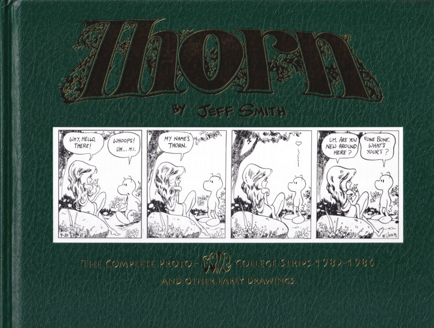 Info édition : Version exclusive à la campagne de financement du livre sur Kickstarter. Hardcover imitation cuir avec dorure à chaud et signet. Contient 50 pages de contenu éditorial : annotations, entretien avec Jeff Smith, journal de création de Thorn, texte de l'éditeur Jim Kammerud et un comparatif entre Thorn et Bone.