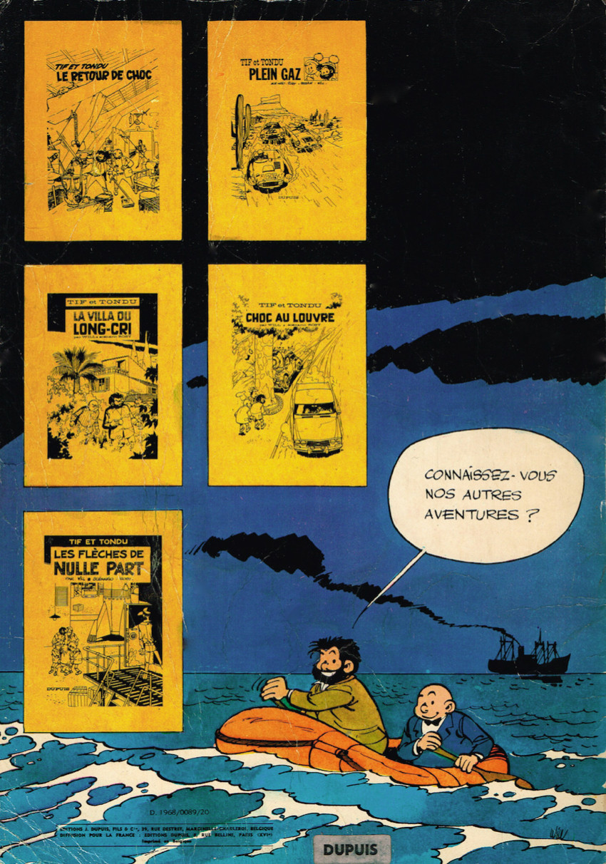 Ridicule fait parti du titre de ce tome et je crois que c’est l’adjectif qui qualifierait le mieux la trame de cette histoire !!! Pour une fois, nous n’avons pas affaire à Choc et du coup j’ai l’impression que l’histoire en pâtit ; tant le terrible fantomas au heaume avait imprégné les précédentes histoires de son ombre menaçante. Rosy ne voulait sans doute pas surexploiter le personnage… On a l’impression que Rosy livre un scénario totalement fantaisiste, sans se soucier des convenances. Mais la fraîcheur qu’il y avait dans les premières aventures de Tif et Tondu écrites par ce scénariste semble ici avoir totalement disparu. Nos deux héros sont à la poursuite d’une poupée qui semble receler un bien mystérieux secret. Ça court dans tous les sens dans des pays imaginaires au nom farfelu de Taura-Atarétala ou Taurala-Atarété (excusez du peu !!!) ; et dans le genre jeu de mot foireux (ou devrai-je dire pathétique) on a aussi droit à un personnage du nom de Lepaire-Nohel !!! Que dire de plus… Donc, c’est une aventure sans queue ni tête qui est à mettre au fond d’une corbeille dans la carrière de Tif et Tondu. Cependant, quelques points intéressants : le dessin de Will reste toujours aussi bon, même si je l’ai senti parfois plus inspiré et on apprend au détour d’une case que Tif et Tondu rédigent un livre sur leur précédente aventure. Alors sont-ils écrivains ou journalistes, ou tout simplement des détectives qui narrent leurs exploits ? Le mystère demeure…Le 20/05/2021 à 11:32:19