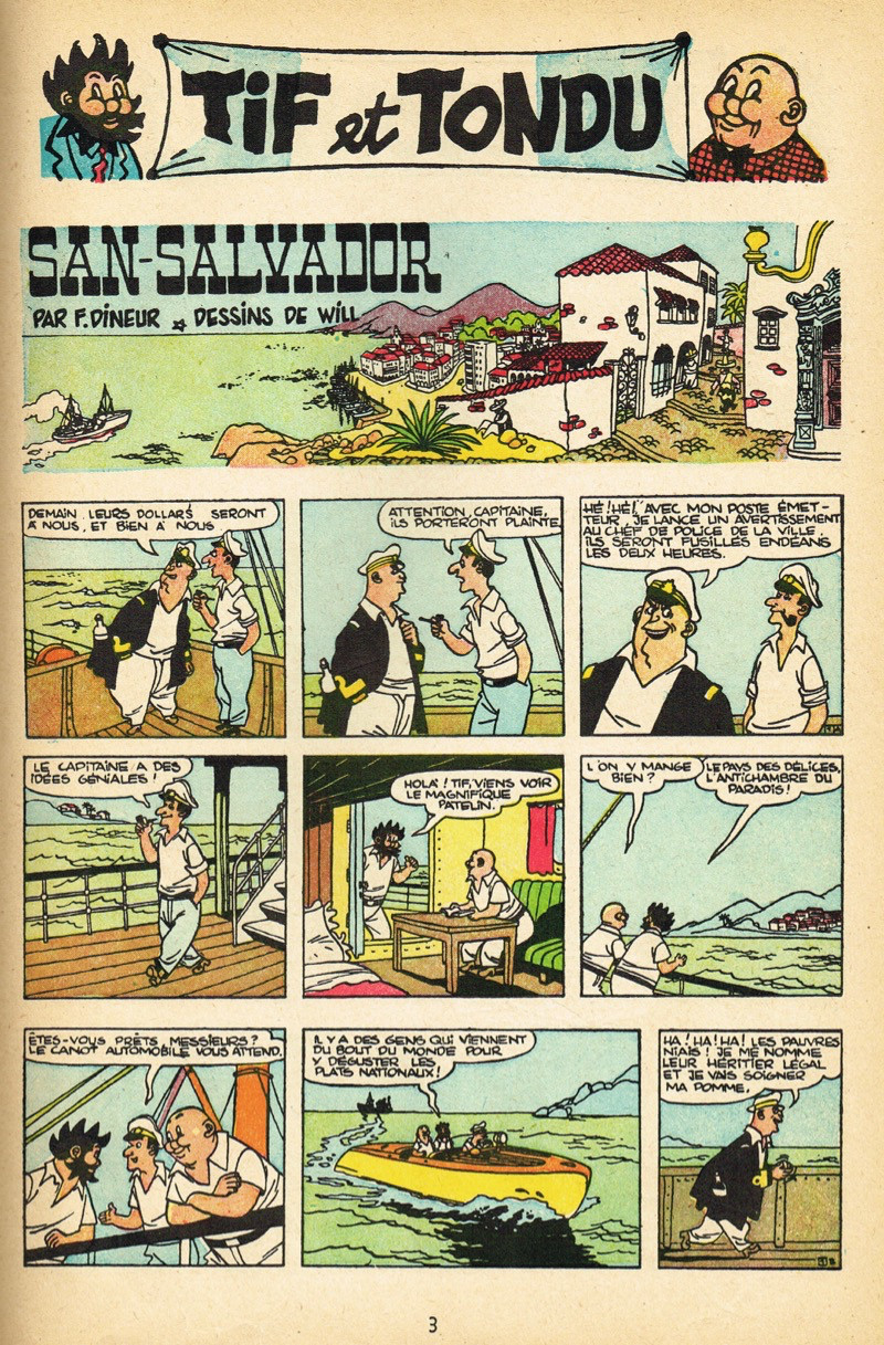 Résumé: Dénoncés comme fauteur de troubles par un capitaine de bateau vénal, Tif et Tondu sont arrêtés par les autorités du San Salvador. Tif va être nommé général des Forces Expéditionnaires et devra mener bataille contre Santa Ana. Parti à la recherche de Tondu, simple soldat, ils seront fait prisonniers par le camp adverse. Au moment du châtiment, le volcan se réveille et c’est la panique à Santa Ana. Délivré de ses liens, le Général Tif prendra-t-il les armes ou de bonnes résolutions pour sauver des vies ? Tif et Tondu ont été conviés par le señor Crapoloto car de mystérieux fantômes font leur apparition dans la ville, créant la panique et la fuite de ses habitants. En menant leur enquête, Tif et Tondu vont découvrir qu’une ancienne mine d’or est à l’origine de toute cette agitation. Parviendront-ils à mettre la main sur ces fantômes ? C’est le jour du grand nettoyage. Dans le grenier, Tif tombe sur un drôle de bidule avec un truc brillant au fond. Curieux comme pas deux, il y glisse la main et… bardaf le voilà coincé. Tondu tentera de l’aider à extraire sa main de la boîte « magique ». Quand il y arrivera enfin, celle-ci se coincera dans la main du facteur, de passage chez eux. Il y a 3 ans de cela, le comte de Casteljac disparaissait sans laisser la moindre trace. Lors de l’ouverture de son testament et la lecture de sa lettre laissée chez le Notaire Chalançon, son neveu n’hérite finalement que d’une énigme ! Il mandate alors Tif & Tondu pour résoudre cette note originale et retrouver les bijoux. Nos détectives se lancent donc sur les traces de ce trésor caché…