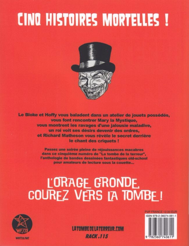 Résumé: Le Bloke et Hoffy vous baladent dans un atelier de jouets possédés, vous font rencontrer Mary la Mystique, vous montrent les ravages d'une jalousie maladive, un roi voit ses désirs devenir des ordres, et Richard Matheson vous révèle le secret derrière le chant des criquets ! Passez une soirée pleine de réjouissances macabres dans ce cinquième numéro de La Tombe de la terreur, l'anthologie de bandes dessinées fantastiques old-school pour amateurs de lecture sous la couette.