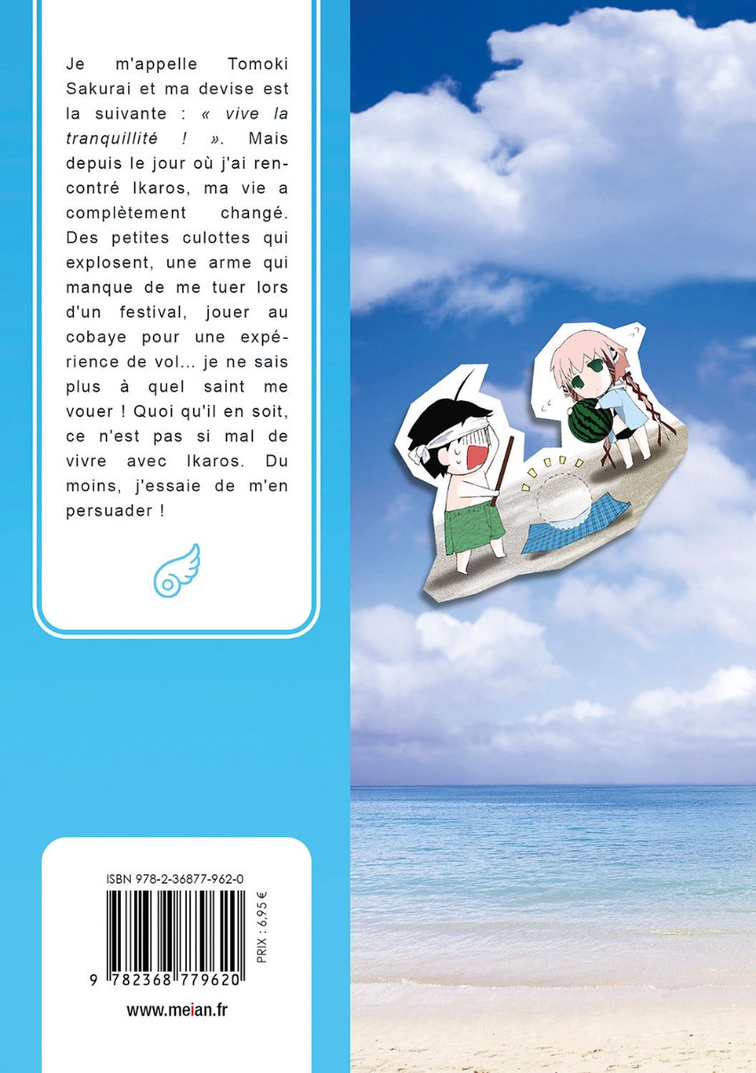 Résumé: Je m'appelle Tomoki Sakurai et ma devise est la suivante : « vive la tranquillité ! ». Mais depuis le jour où j'ai rencontré Ikaros, ma vie a complètement changé. Des petites culottes qui explosent, une arme qui manque de me tuer lors d'un festival, jouer au cobaye pour une expérience de vol... je ne sais plus à quel saint me vouer ! Quoi qu'il en soit, ce n'est pas si mal de vivre avec Ikaros. Du moins, j'essaie de m'en persuader !