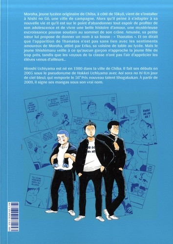 Résumé: Moroha, jeune lyce´en originaire de Chiba, a` co^te´ de To^kyo^, vient de s'installer a` Nishi no Go^, une ville de campagne. Alors qu'il peine a` s'adapter a` sa nouvelle vie et qu'il est sur le point d'abandonner tout espoir de profiter de son adolescence et de vivre une belle histoire d'amour, une myste´rieuse excroissance pousse soudain au sommet de son cra^ne. Amuse´e, sa petite soeur lui propose de donner un petit nom a` sa bosse : « Thanatos ». Et on dirait que l'apparition de Thanatos n'est pas sans lien avec les sentiments amoureux de Moroha, attire´ par Eriko, sa voisine de table au lyce´e. Mais le jeune Shishimaru veille a` ce qu'aucun garc¸on n'approche la jeune fille de trop pre`s, tandis que les voyous de la classe n'ont pas l'air d'appre´cier les e´le`ves venus d'ailleurs...