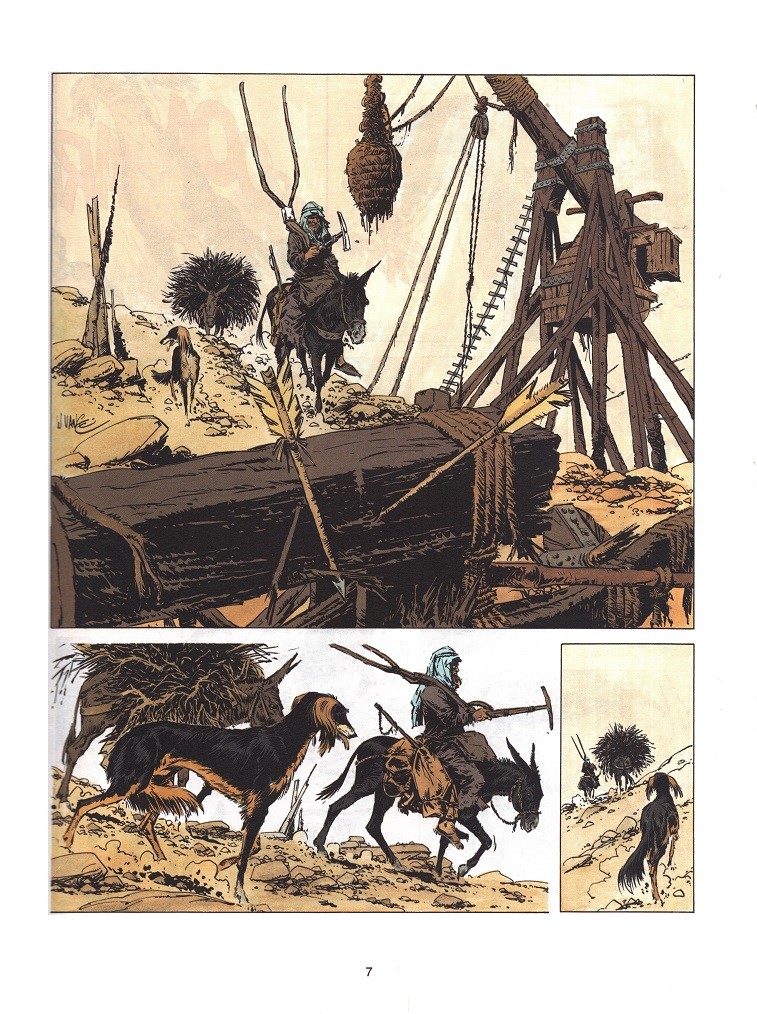 Résumé: Le beau chevalier Rodric a du coeur et surtout de la vaillance. Avec ses compagnons d'armes, il veille au maintien de l'autorité des Croisés sur Jérusalem. Il s'y est fait quelques amis, dont un marchand. Ce dernier doit faire face à l'odieux chantage d'un de ses créanciers: soit il le rembourse immédiatement, soit il lui donne sa fille Blanche en mariage. Rodric se propose d'aider la jeune fille à fuir et de l'escorter jusqu'à la ville où réside son oncle... Mais, c'est un voyage à hauts risques: la route traverse des régions inhospitalières, infestées de pillards et contrôlées par les Musulmans... Au bout de quelques jours de marche dans le désert , tel un mirage, surgit un groupe de farouches guerriers avec à leur tête, une mystérieuse cavalière prénommée Amathéa qui disparaît comme par enchantement après avoir assuré Rodric de sa protection! A quelques lieues de là, les fugitifs recueillent les dernières paroles du survivant d'un massacre. Celui-ci est ismaëlien. Issu des confins de la Perse, son peuple est persécuté par les Islamistes qui le considèrent comme hérétique et , pour s'en défendre, son chef l'a chargé de conclure un traité d'alliance avec les Croisés. Ce traité signé contrarie les plans des Musulmans et aussi ceux des Templiers déterminés à s'approprier Jérusalem. Encouragé par Blanche, Rodric décide de mener à son terme, la mission de cet émissaire ismaëlien... Rencontré dans une oasis du désert de Syrie, un adolescent va guider les voyageurs jusqu'à la forteresse où sont retranchés les Ismaëliens. Mais, pas plus que les détrousseurs de caravanes, les Musulmans et les Templiers n'ont désarmé. Capturés par les soldats d'un sultan irakien, Rodric et ses amis parviennent à s'échapper avec la complicité du grand vizir qui n'est autre qu'un espion ismaëlien. Craignant un coup d'Etat, le potentat lance ausssitôt ses gardes aux trousses des évadés. Par bonheur, Amathéa et ses guerriers surgissent une fois encore comme par enchantement et neutralisent les poursuivants. De leur côté, les Templiers tentent de faire croire au chef des Ismaëliens que les Croisés l'ont trompé et se préparent à attaquer sa forteresse...