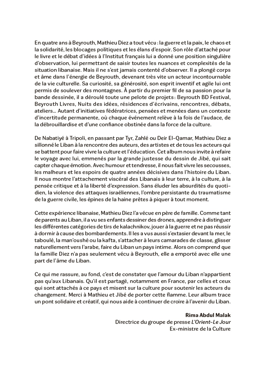 Quand Mathieu Diez part vivre à Beyrouth avec sa famille pour travailler au sein de l'ambassade de France, il découvre une ville dévastée par la crise économique et l'explosion du port, mais pleine d'intensité et passionnante. Entre chronique du quotidien, du travail en ambassade, et de la guerre d'octobre 2024, il brosse un portrait sensible et sincère de Beyrouth et du Liban.