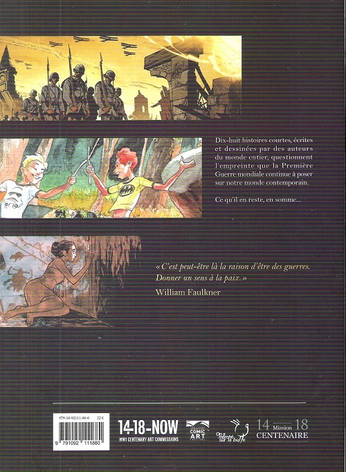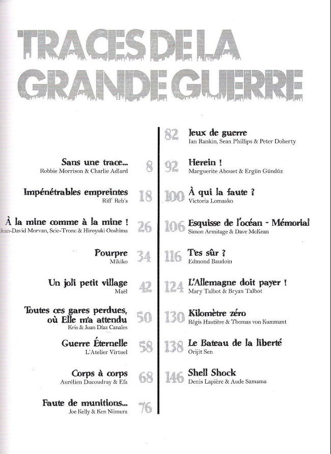 Traces de la grande guerre est une bd par un collectif d’auteurs pour nous remémorer 100 ans après la fin de la Première Guerre Mondiale qui a tant meurtri de familles en France et plus largement en Europe jusqu’aux Etats-Unis venu nous secourir. J’aime rappeler, pour ceux qui critiquent ce pays, qu’ils nous ont aidé à mettre fin à cette guerre de tranchée interminable. Ceci constitue bien un fait historique et non un jugement de valeur. Ce n’est pas la première fois que je lis une bd collective sur ce sujet. C’est toujours au fond pour souligner les mêmes choses dans un devoir de mémoire collective. Cette guerre a été horrible et très couteuse en hommes. La France a d’ailleurs perdu beaucoup plus de vies que durant la Seconde Guerre Mondiale. C’est la critique que je fais généralement à ce type de bd à savoir qu’il y a des récits qui sont forts marquants et d’autres moins satisfaisants. Bref, cela dépend des auteurs et de toute cette variété de styles graphiques différents. Dans l’ensemble, c’est plutôt pas mal. A noter que l'ouvrage est sorti simultanément en France et dans les pays anglophones et il a été porté par des outils de médiation dédiés (exposition, fiches pédagogiques, site Web dédié, etc.).BDGest 2014 - Tous droits réservés