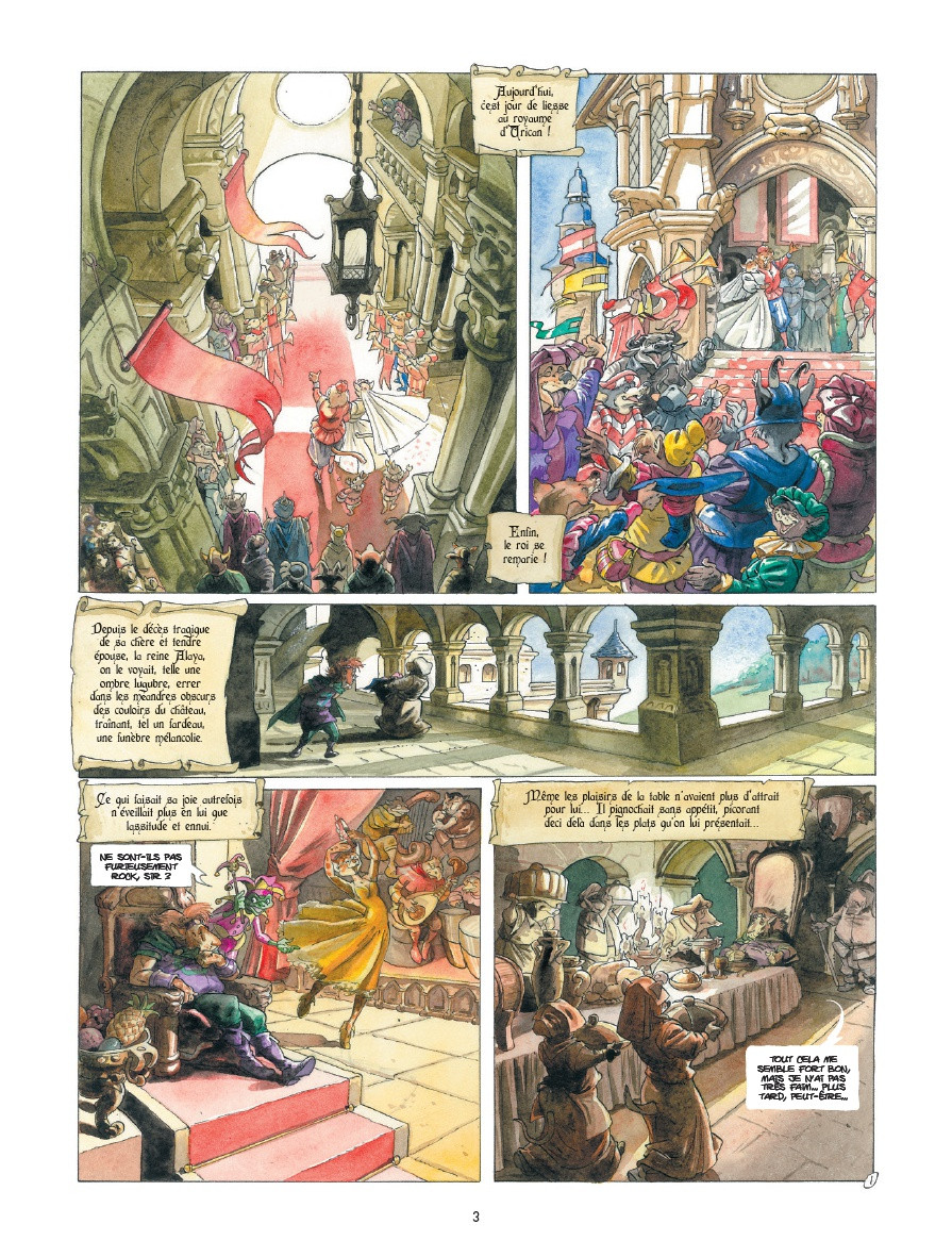 Pour cela il y a d’abord les dessins, aquarelles sur crayonnés, superbes et précis tant dans les couleurs chatoyantes du château que dans la forêt enneigée et les terriers enracinés. L’auteur, habitué au dessin animalier sur les séries Zoé et Pataclop ou Triple Galop dans l’écurie Bamboo est parfaitement à l’aise avec les trombines caricaturales et grimaçantes de ses animaux anthropomorphes. La recette de Disney marche autant dans Blacksad qu’ici et la caractérisation animalière des tempéraments fait rire les adultes et comprendre rapidement aux enfants à qui ils ont affaire. Les aventures de Tracnar et Faribol donnent lieu bien entendu à moultes cabrioles, cascades et combats à coups de cruchons et de broche à cochons… Rabelais (ou Kaamelot!) n’est donc jamais loin tant les deux énergumènes recherchent plus la bonne pitance qu’un hypothétique trésor. Car les gens du peuple se contentent de peu et connaissent la valeur du concret…[...]